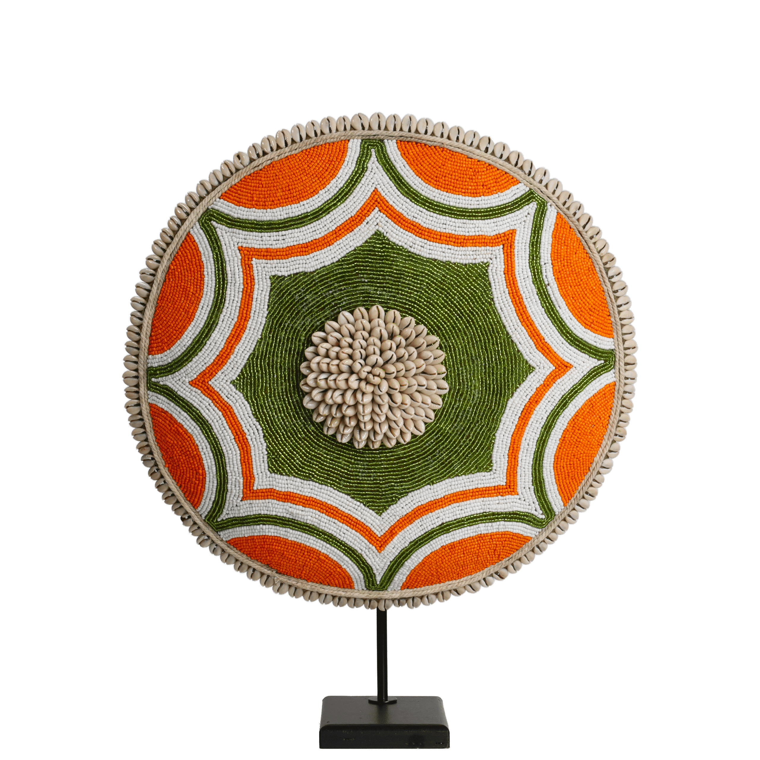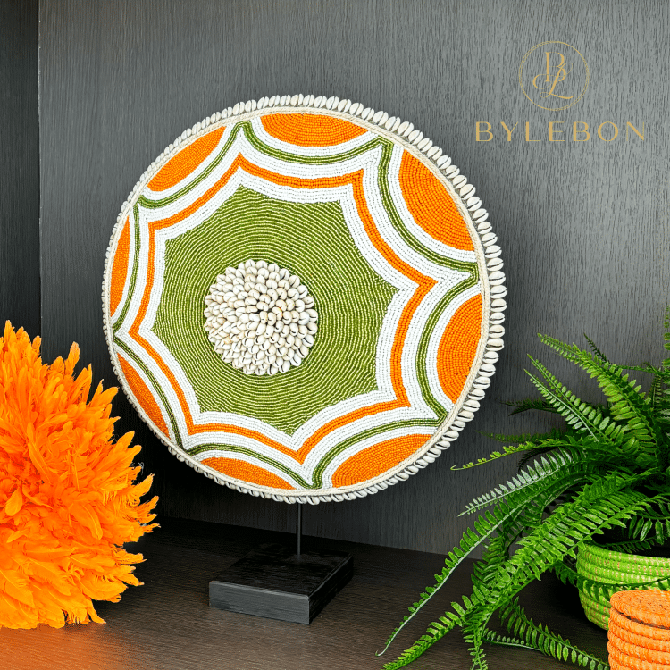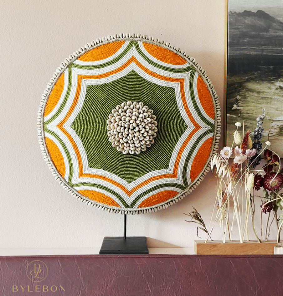 Le Bouclier Perlé – Eef est un magnifique bouclier coloré avec des perles, avec un motif unique orange/vert et un cœur de coquillages cauris.
