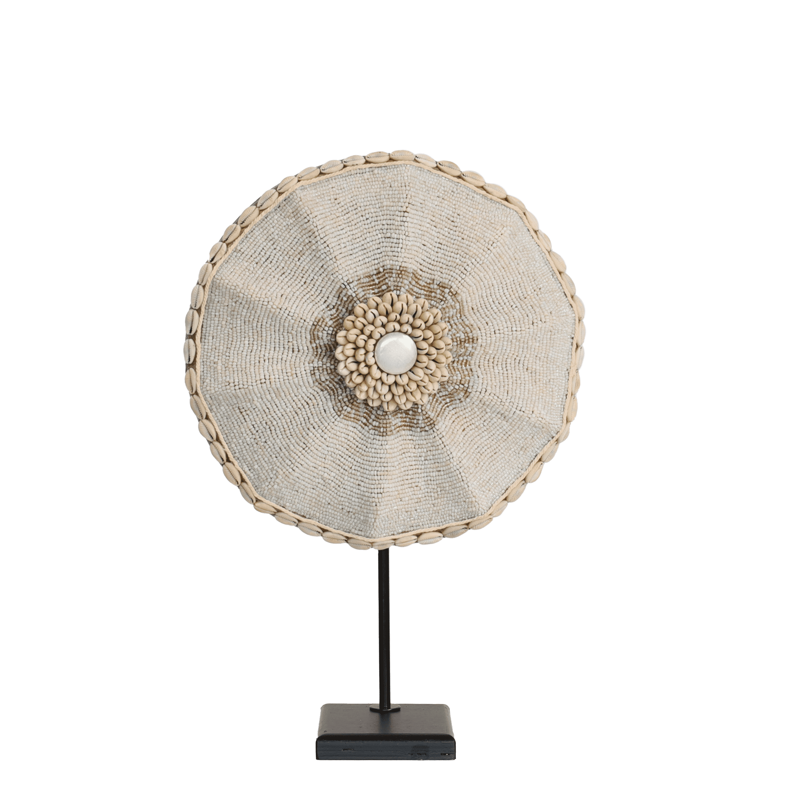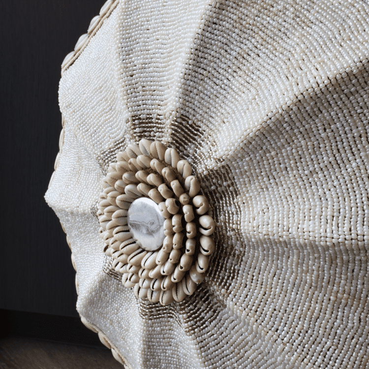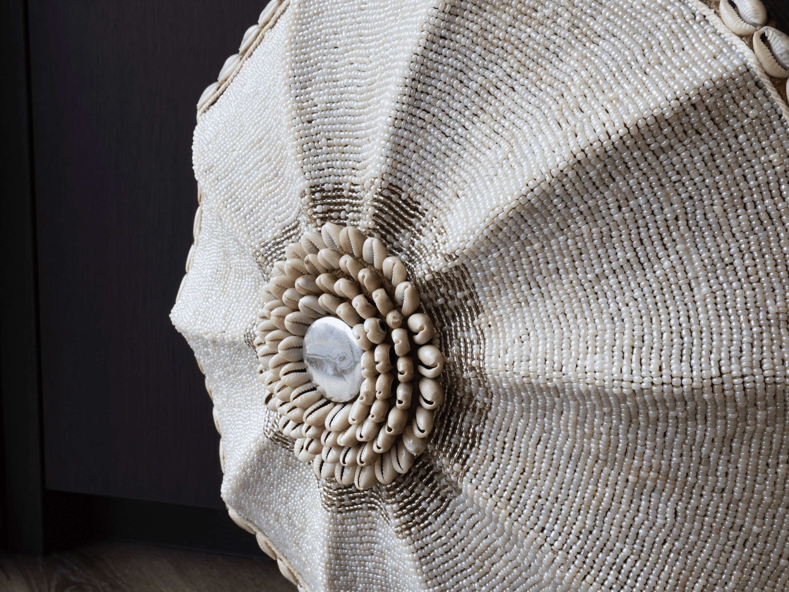 Bouclier Perlé – La Beige (30 cm) est conçu par Larissa (@larissa.interior) et fabriqué à la main par Aboubaka du Cameroun. Il allie une esthétique paisible à un savoir-faire traditionnel. Livré avec son socle.