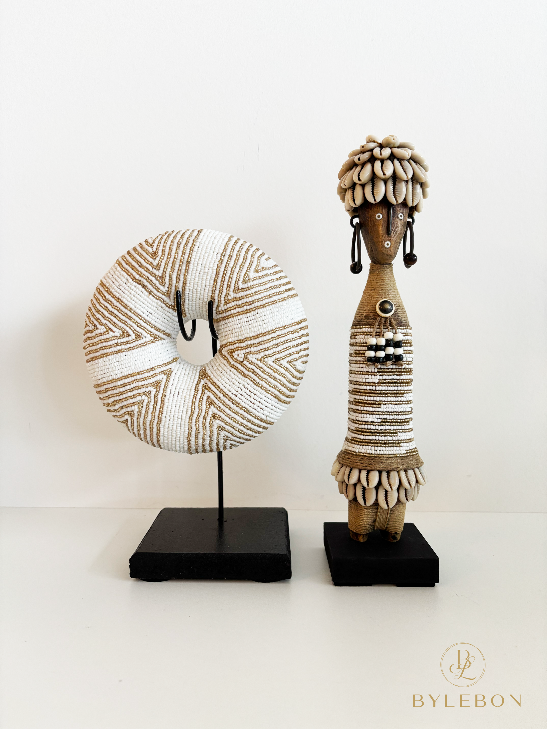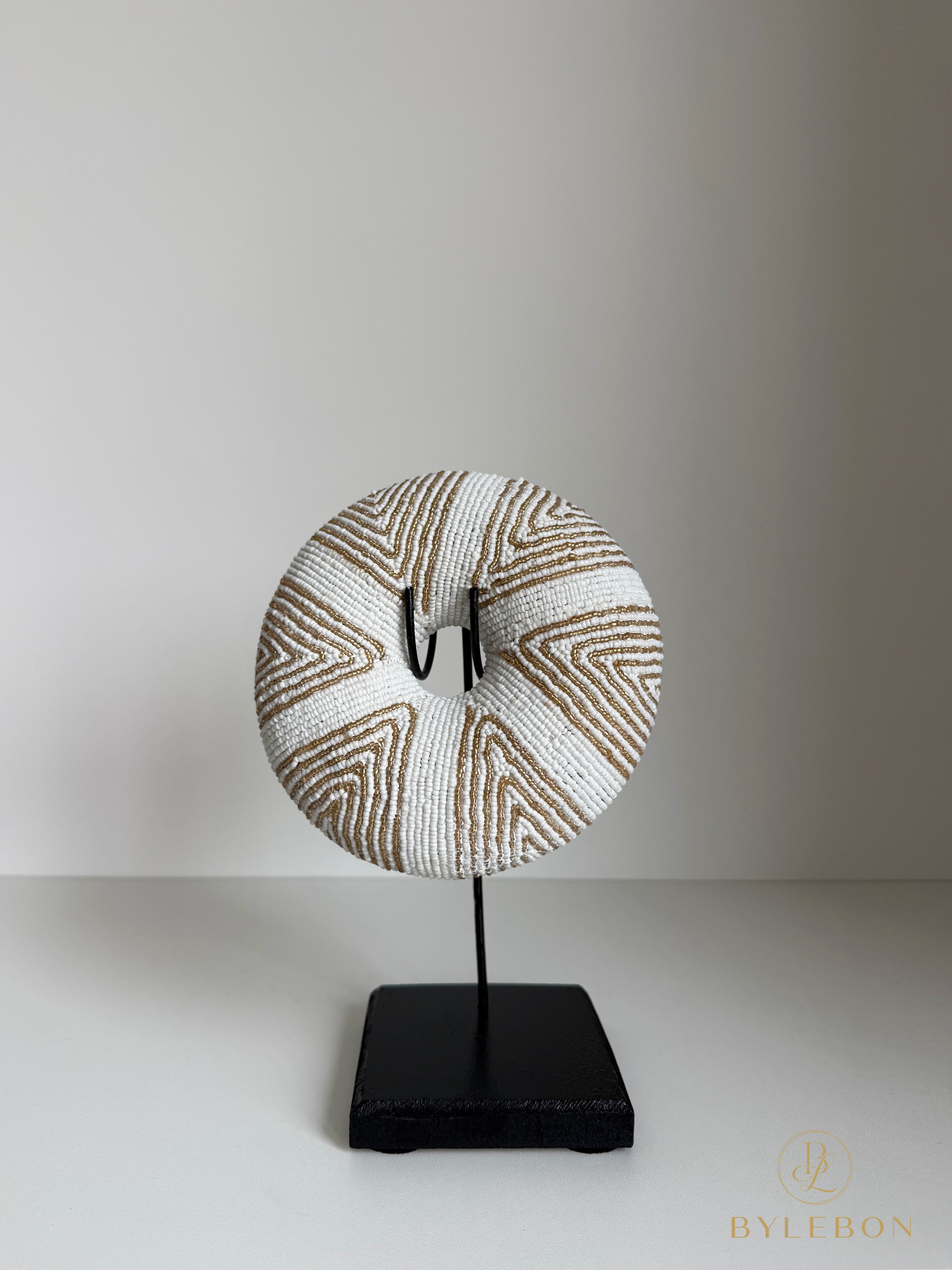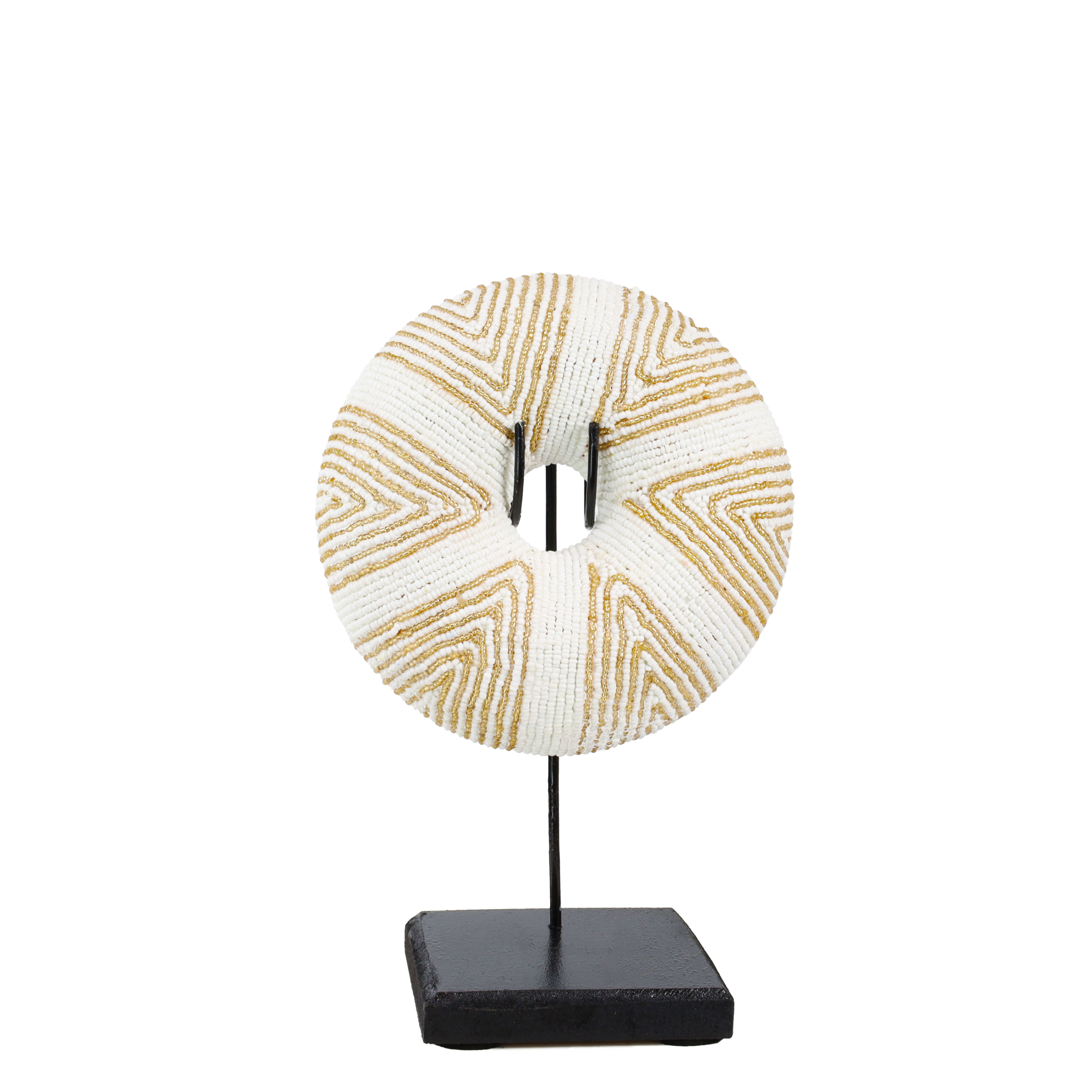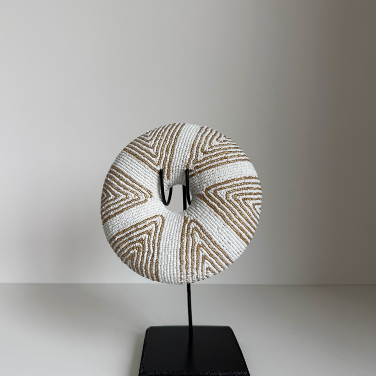 Bracelet jonc perlé fait main en or/blanc, composé de fines perles avec un motif géométrique. Support en bois/métal inclus.