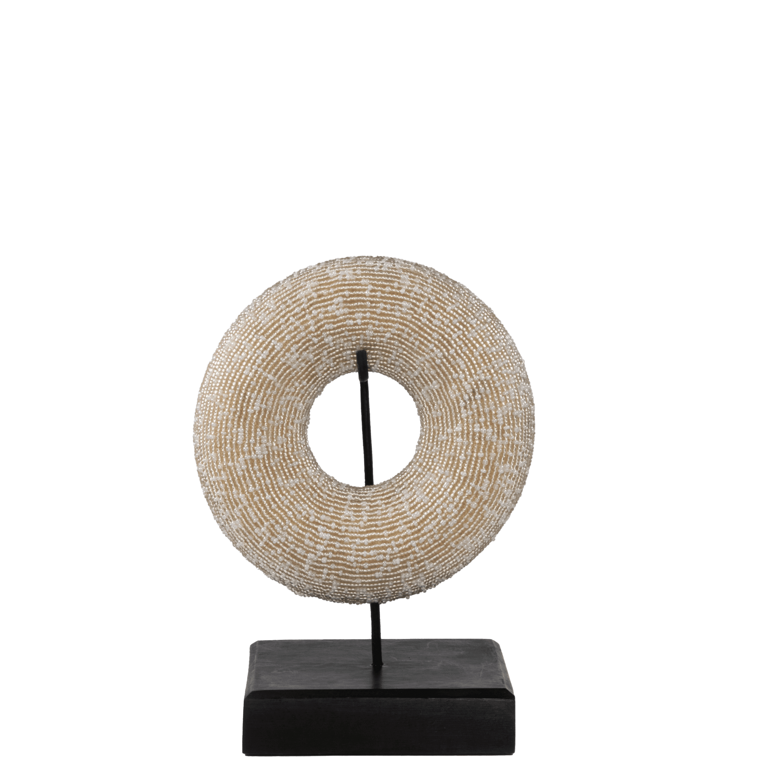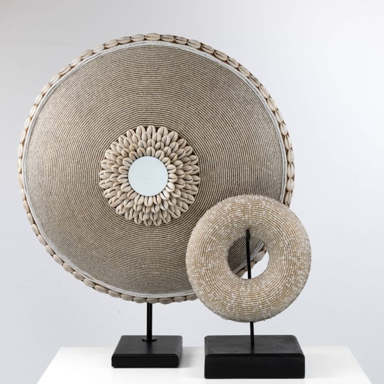 Bracelets faits main du Cameroun avec un diamètre d’environ 17 cm. Ornés de perles transparentes et nacrées et présentés sur un socle noir. Une pièce de décoration unique qui témoigne du savoir-faire africain.