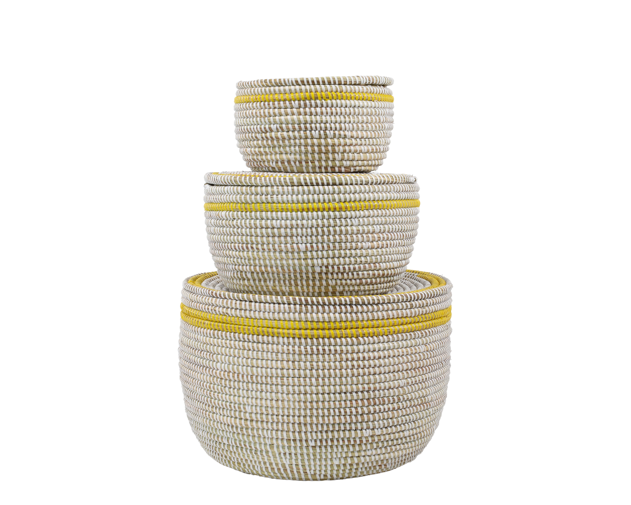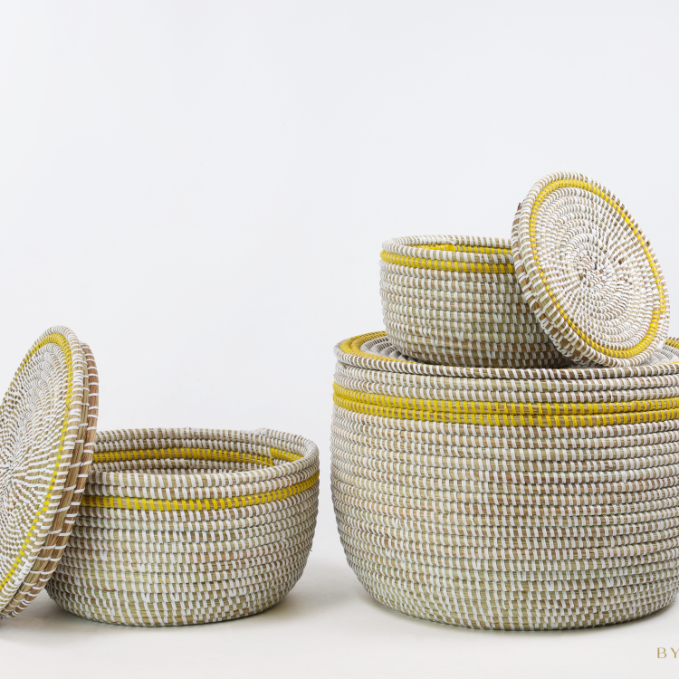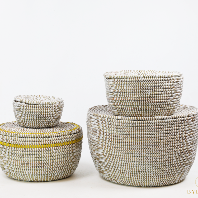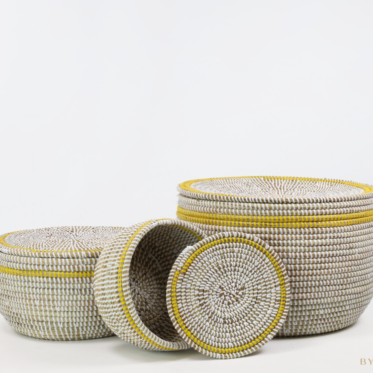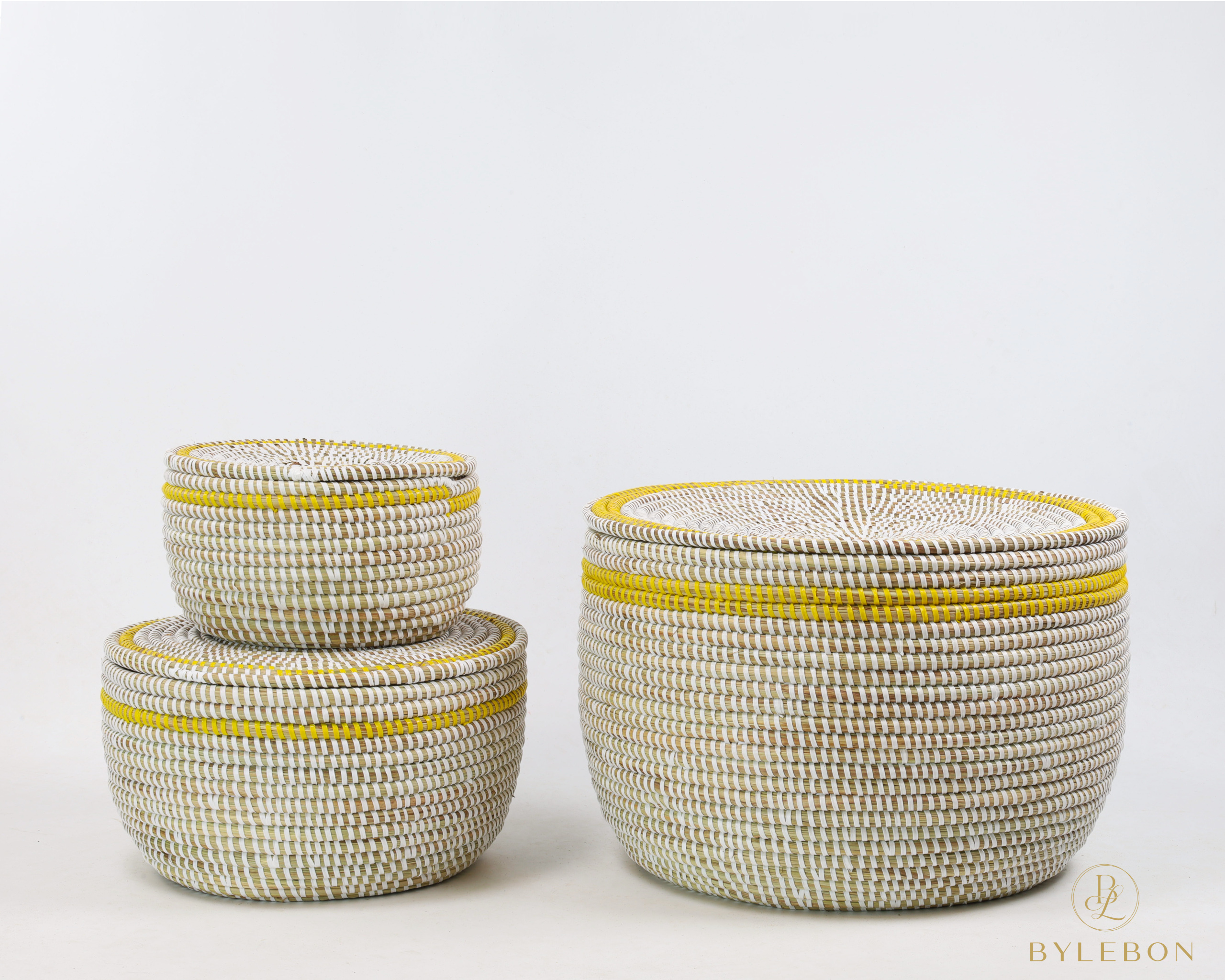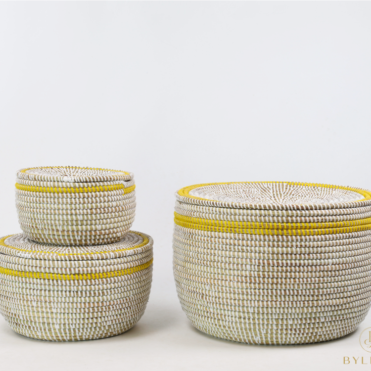 L’ensemble de 3 paniers de rangement – Blanc (avec couvercle plat et bord jaune) se compose de trois paniers en osier de 18, 27 et 37 cm de diamètre. La combinaison de la teinte de base blanche claire avec un bord supérieur jaune vif confère à cet ensemble un aspect ludique et moderne. Les couvercles plats se ferment proprement et rendent les paniers facilement empilables.