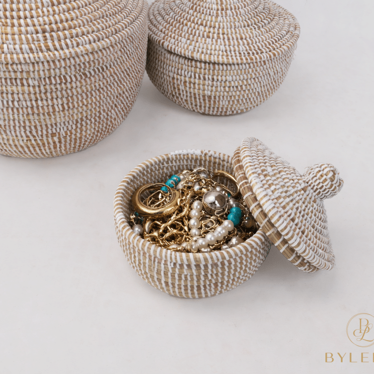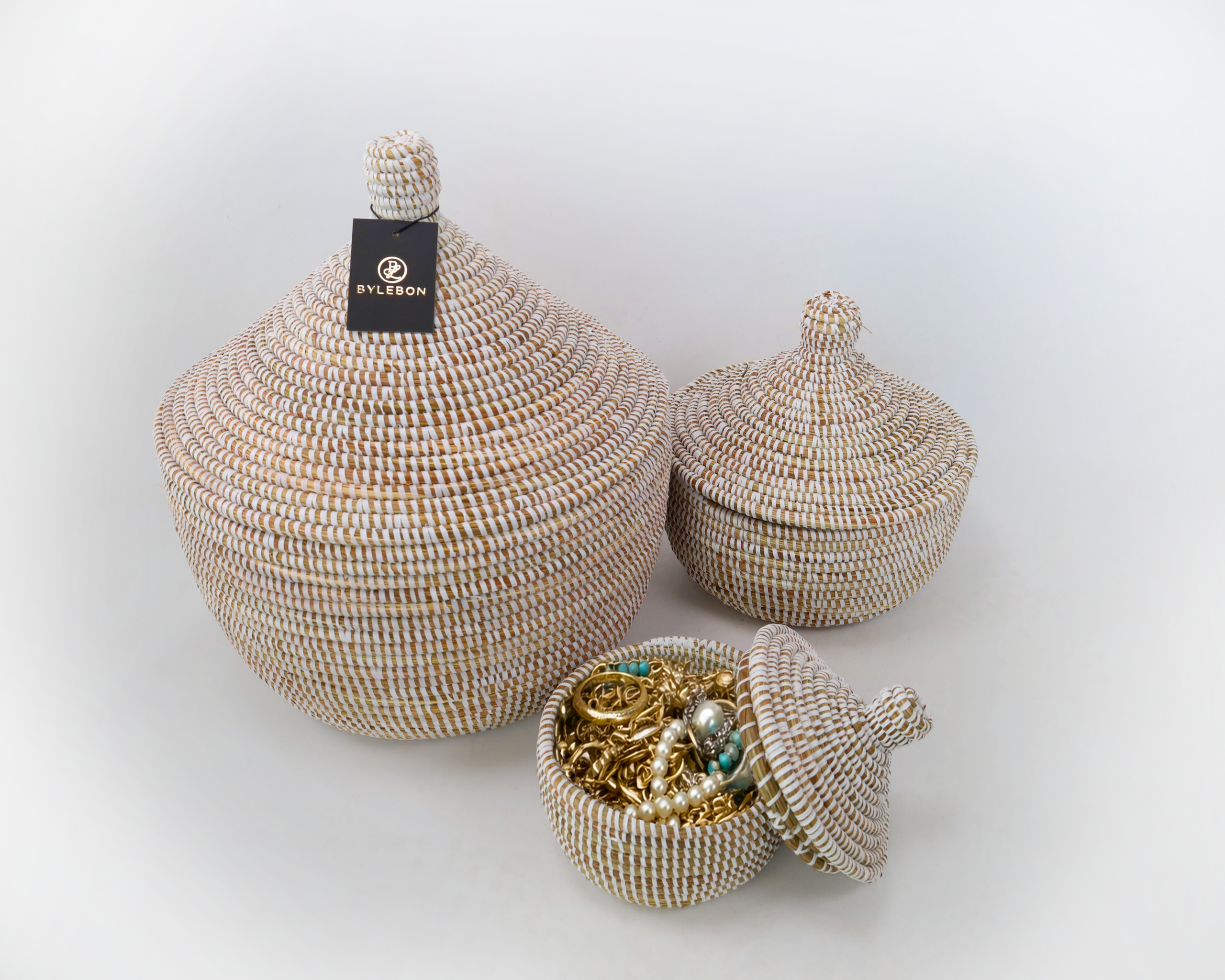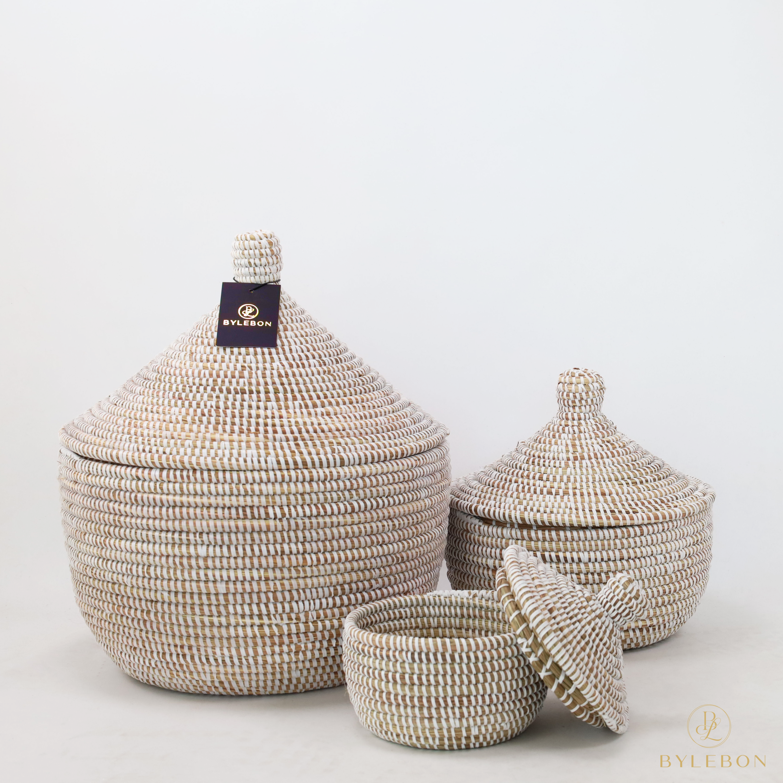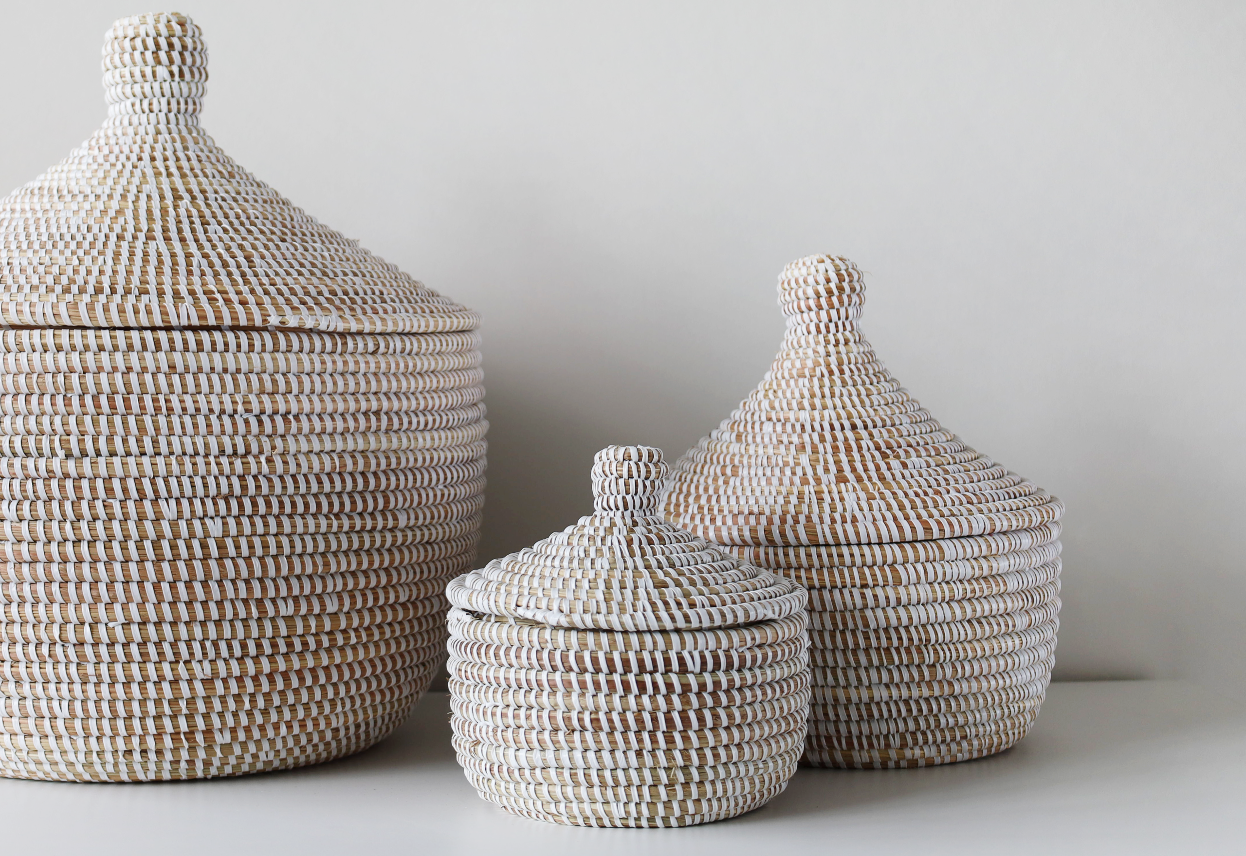Ensemble de 3 paniers tajine faits main en blanc (env. 37, 27 et 18 cm de diamètre). Avec couvercle, pratique et décoratif.