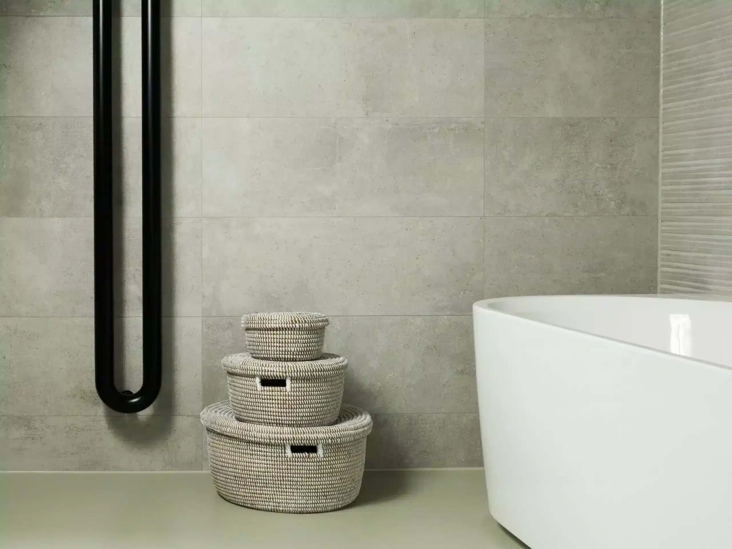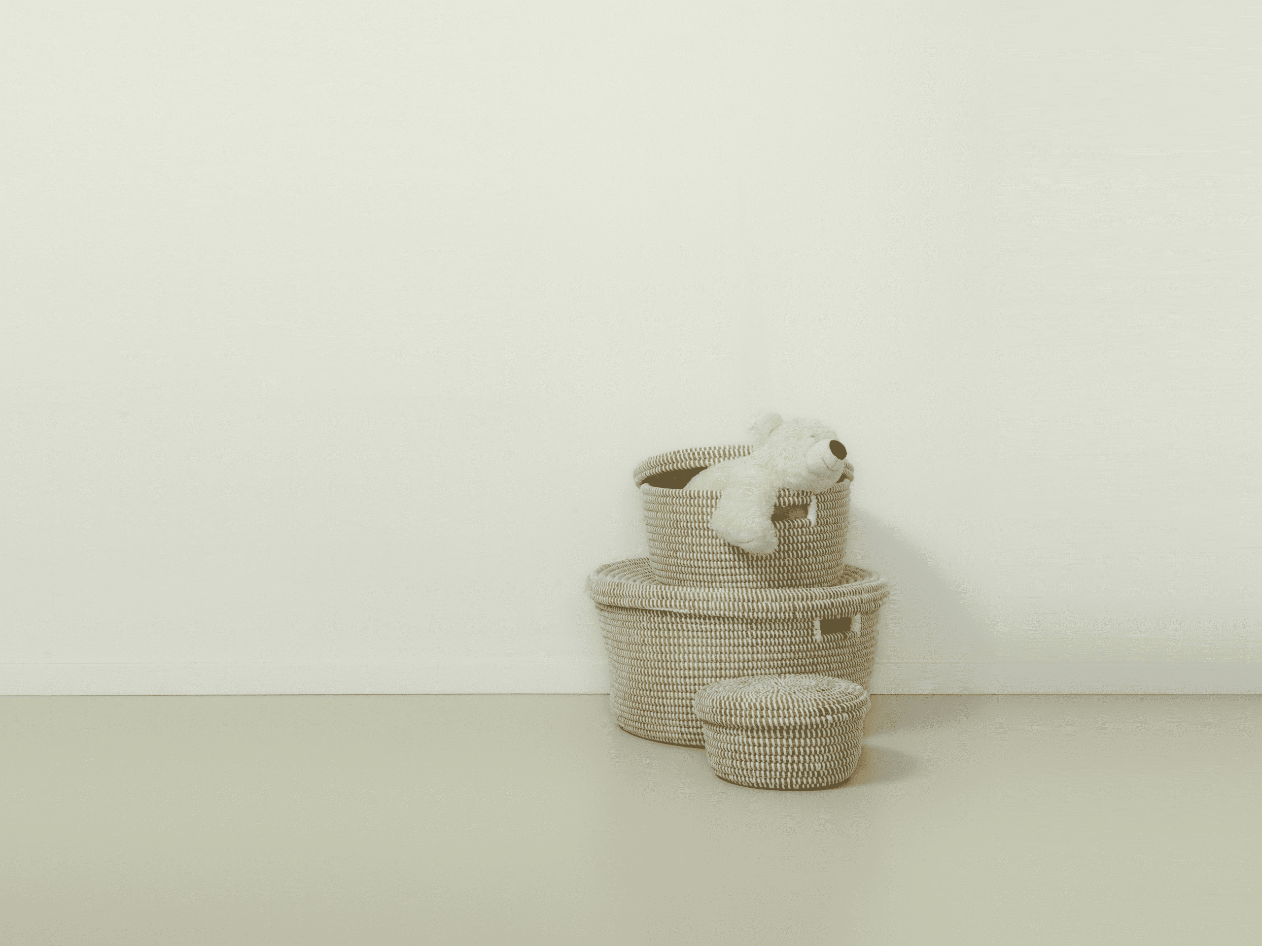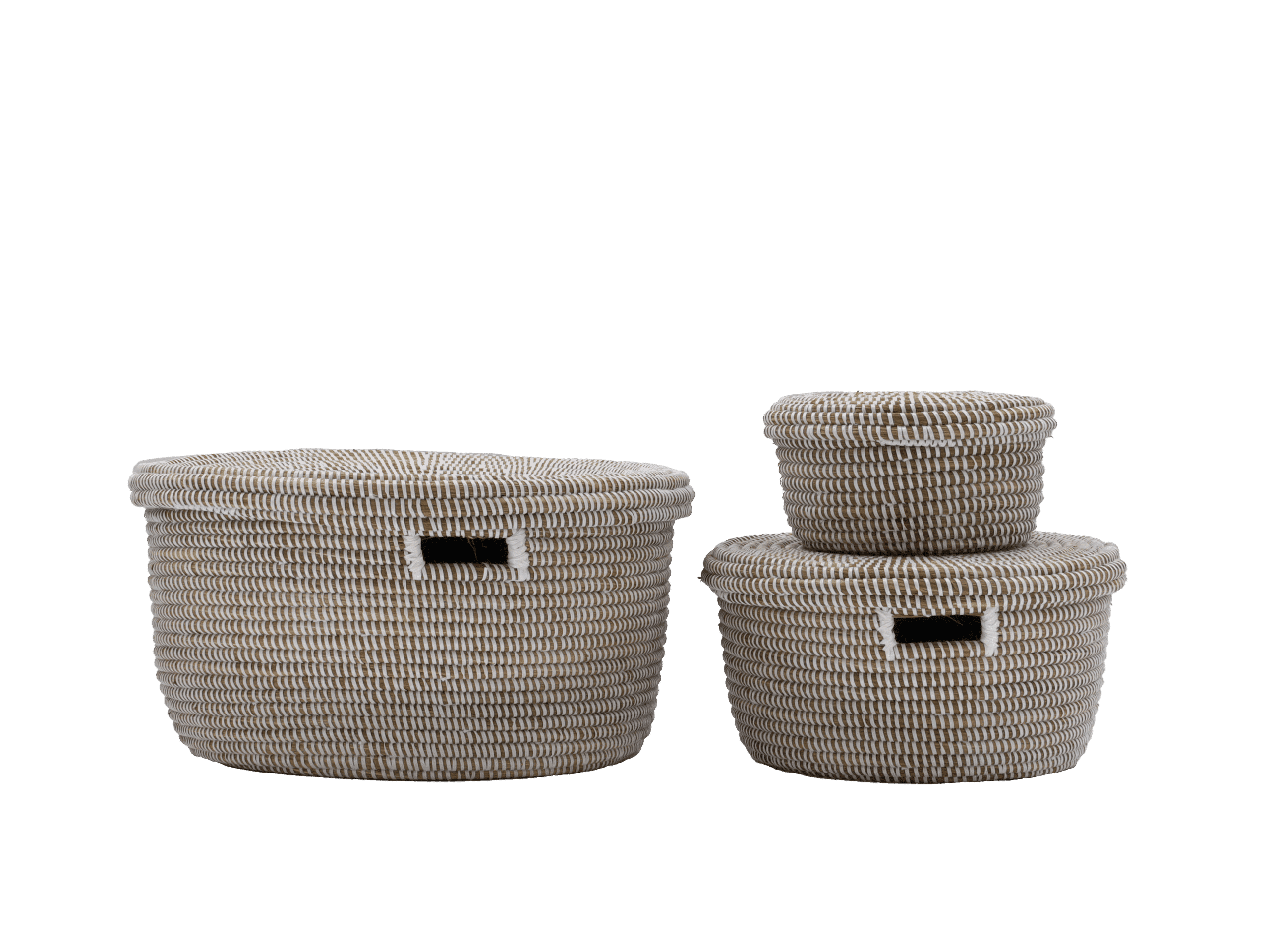 Ensemble de trois paniers faits à la main de différentes tailles avec un motif intemporel. Les dimensions peuvent varier légèrement d’un panier à l’autre, ce qui renforce leur caractère unique.