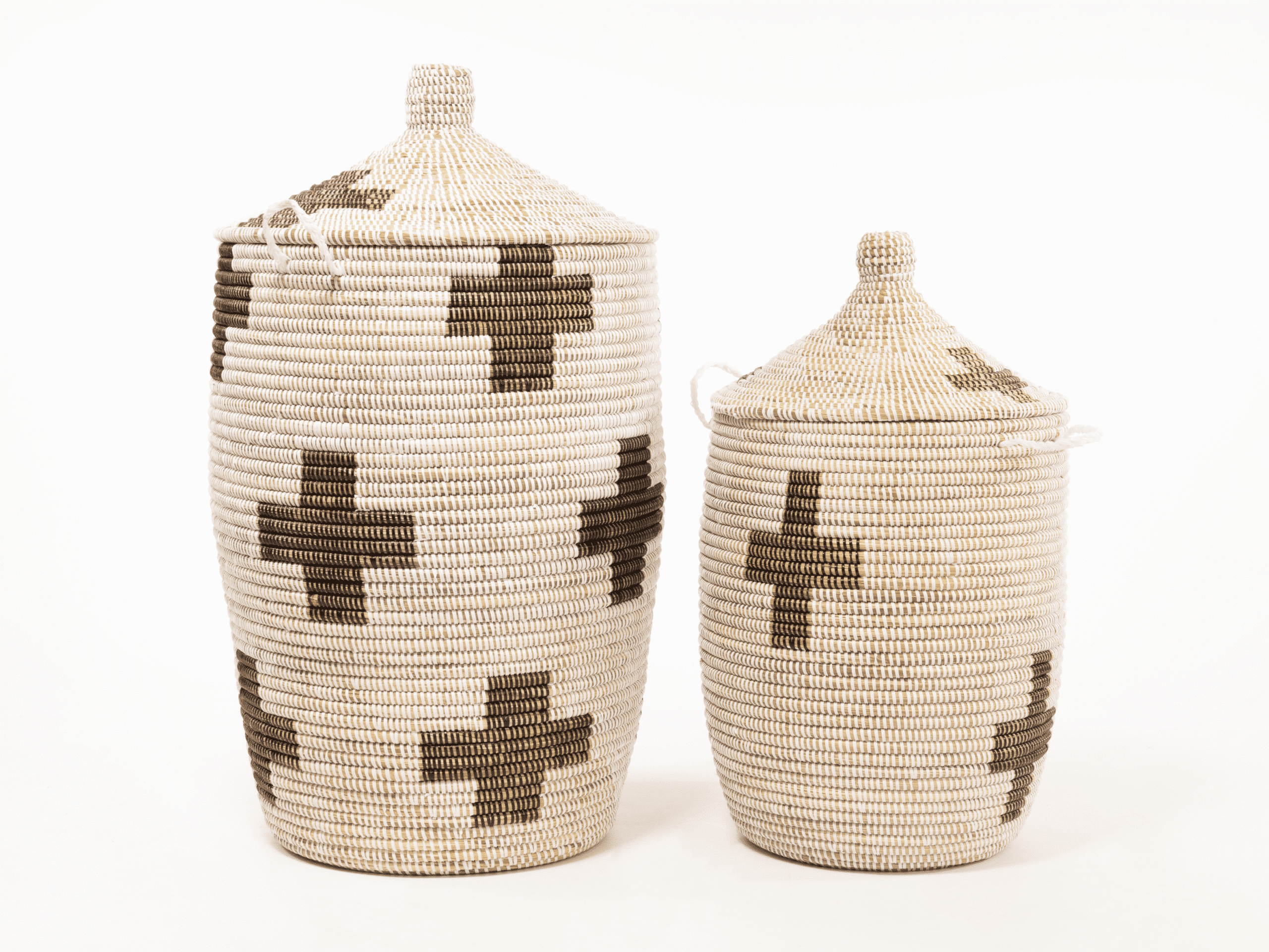 Deux paniers tajine faits à la main du Sénégal avec un motif de croix abstraites en brun sur blanc. L’ensemble spacieux se compose d’un grand panier pour votre salle de bain et d’une version compacte pour la chambre. Grâce aux couvercles verrouillables, vous pouvez facilement y ranger votre linge, vos jouets ou vos plaids.