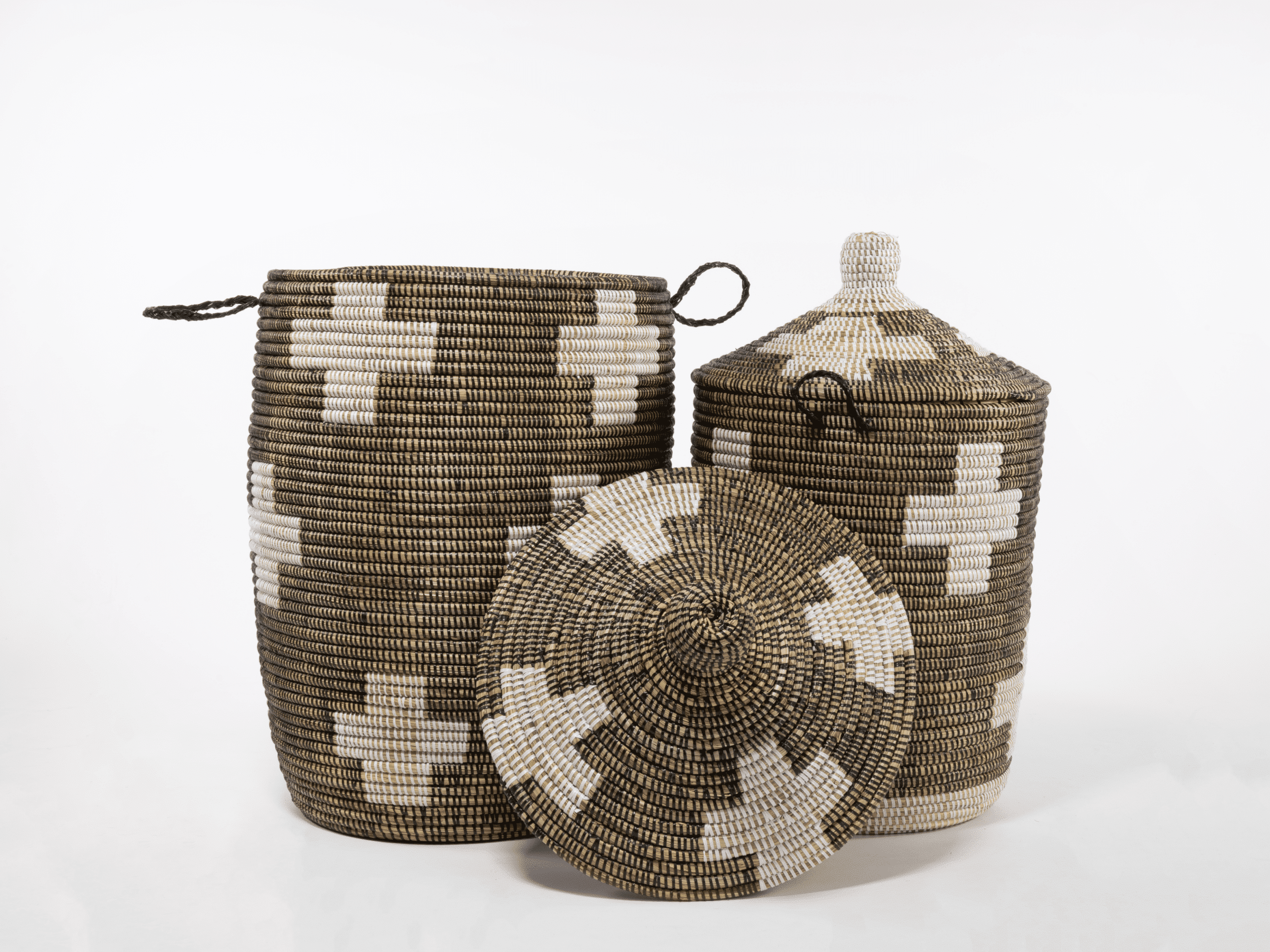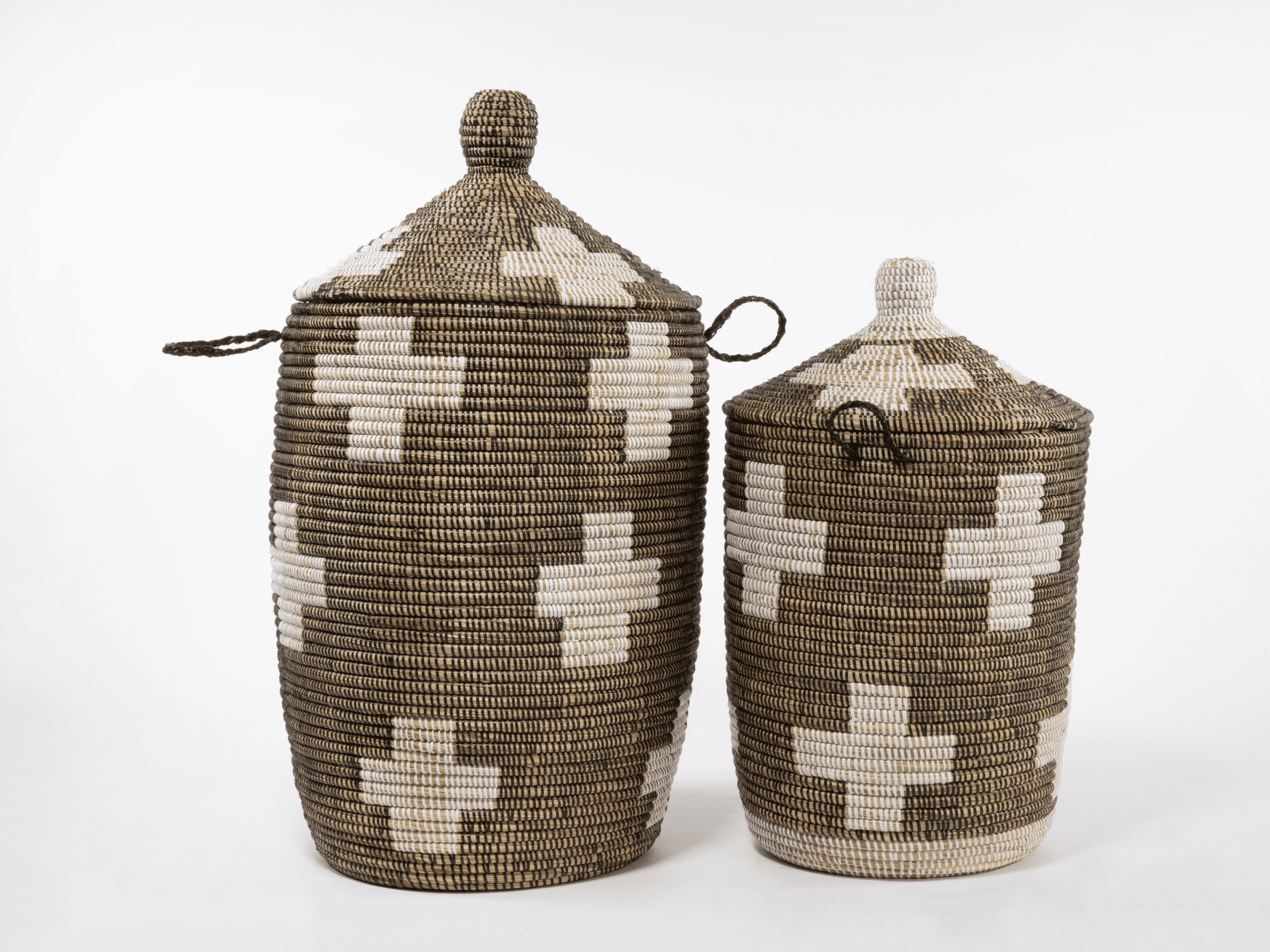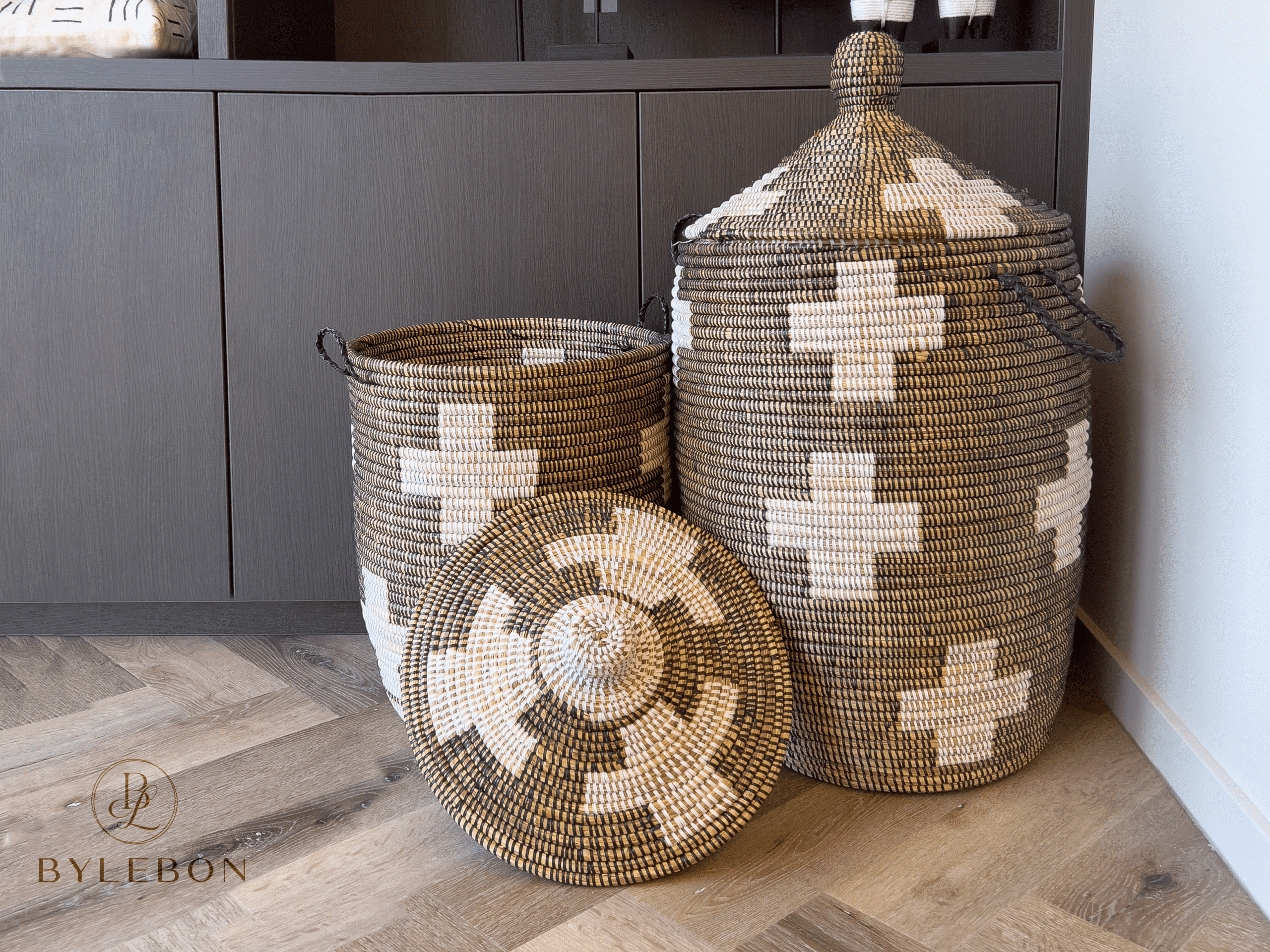 Deux paniers en osier tressés à la main en forme de tajine avec un motif de croix graphique, idéaux pour le linge, les plaids ou les jouets. Les dimensions et la couleur peuvent varier légèrement d’un panier à l’autre en raison de leur caractère artisanal.