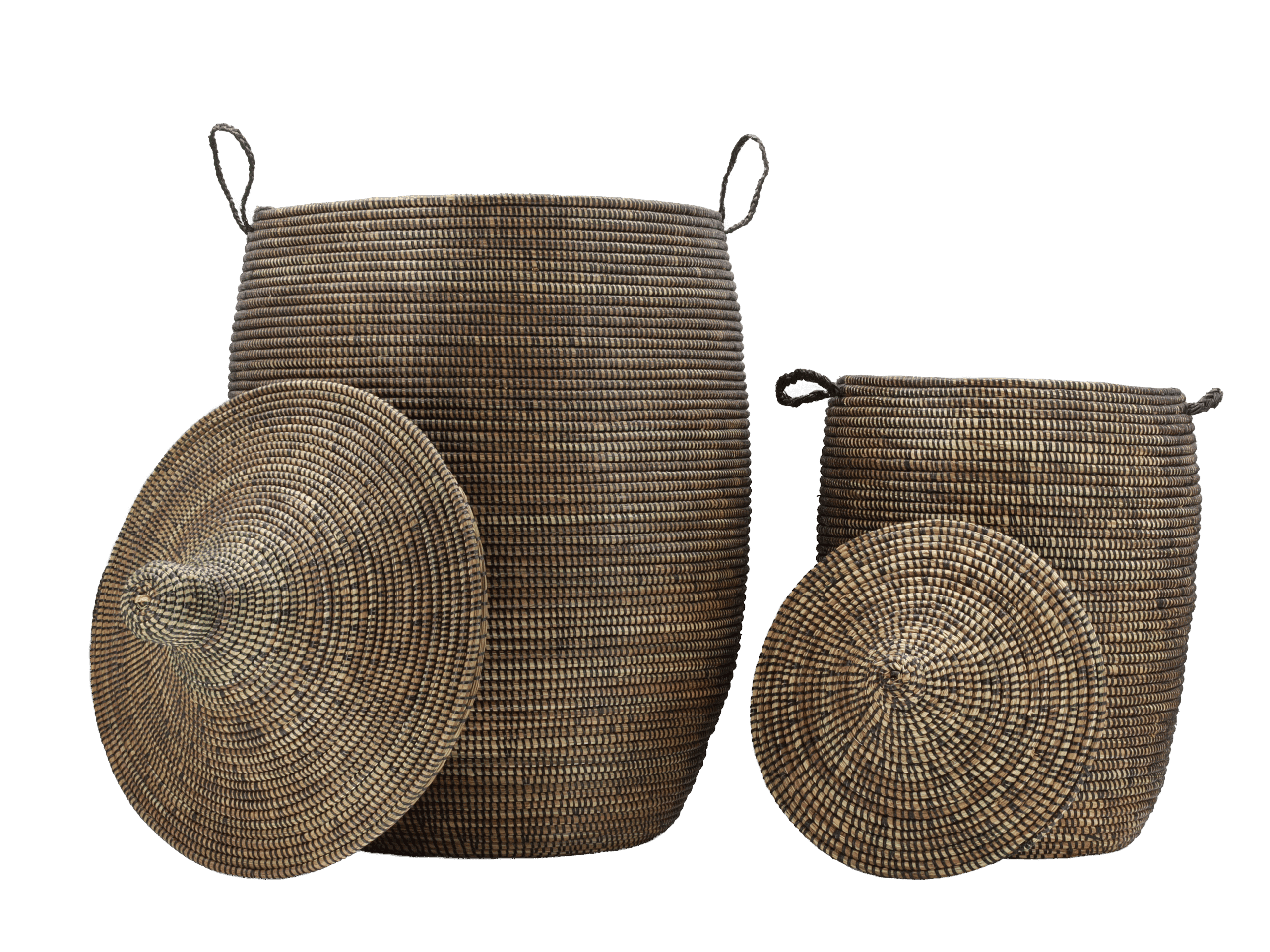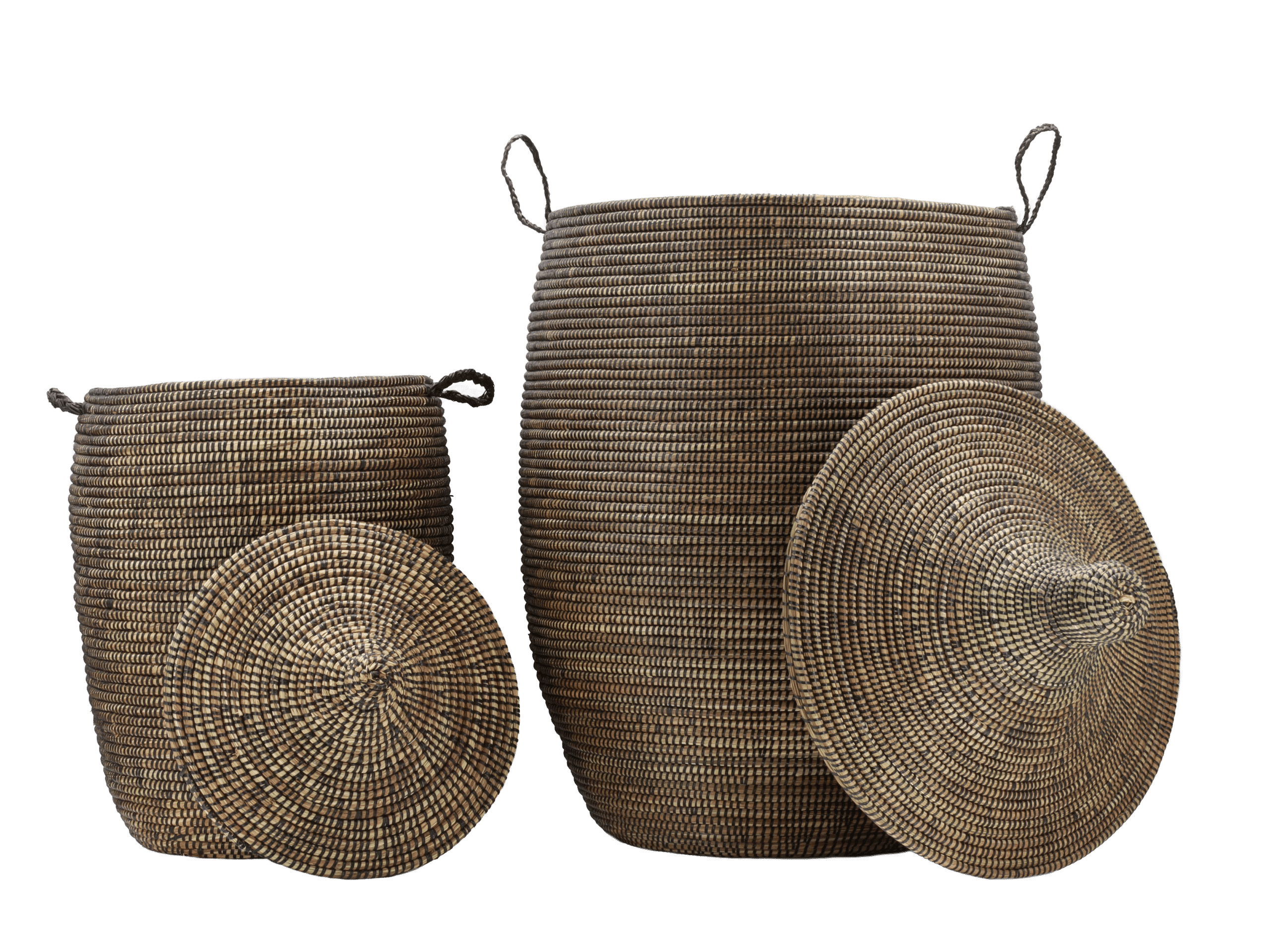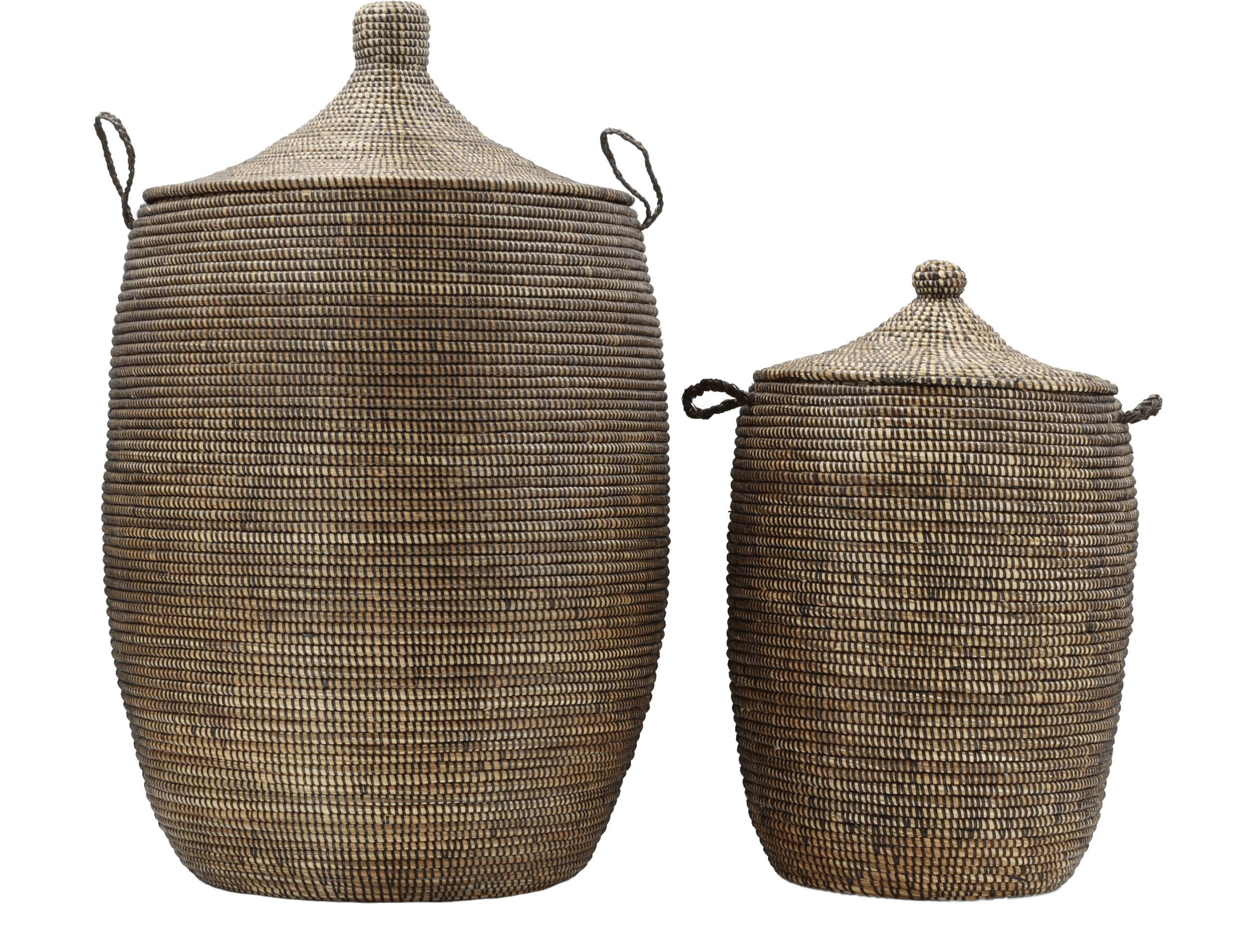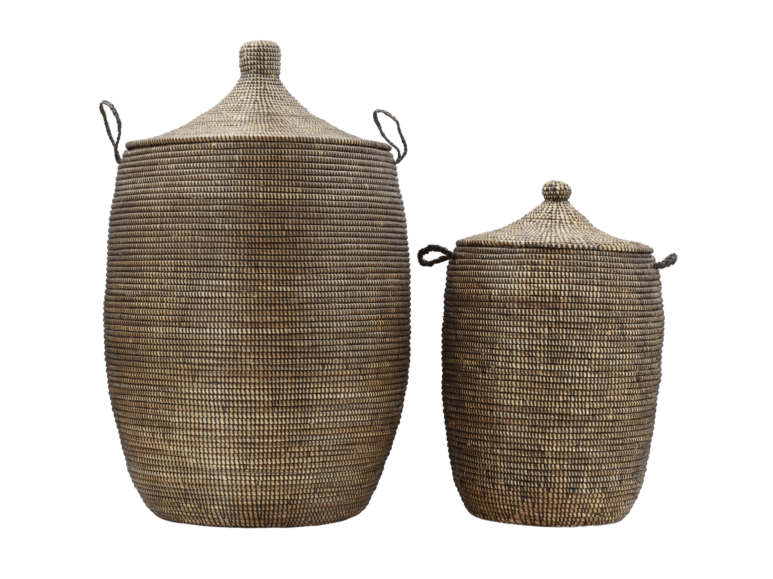 Deux paniers tajine tissés à la main du Sénégal en roseau robuste dans des tons bruns chauds, parfaits pour le linge, les plaids ou les jouets.
