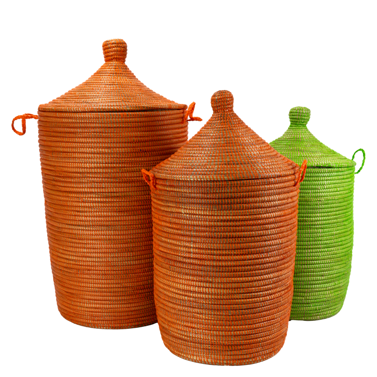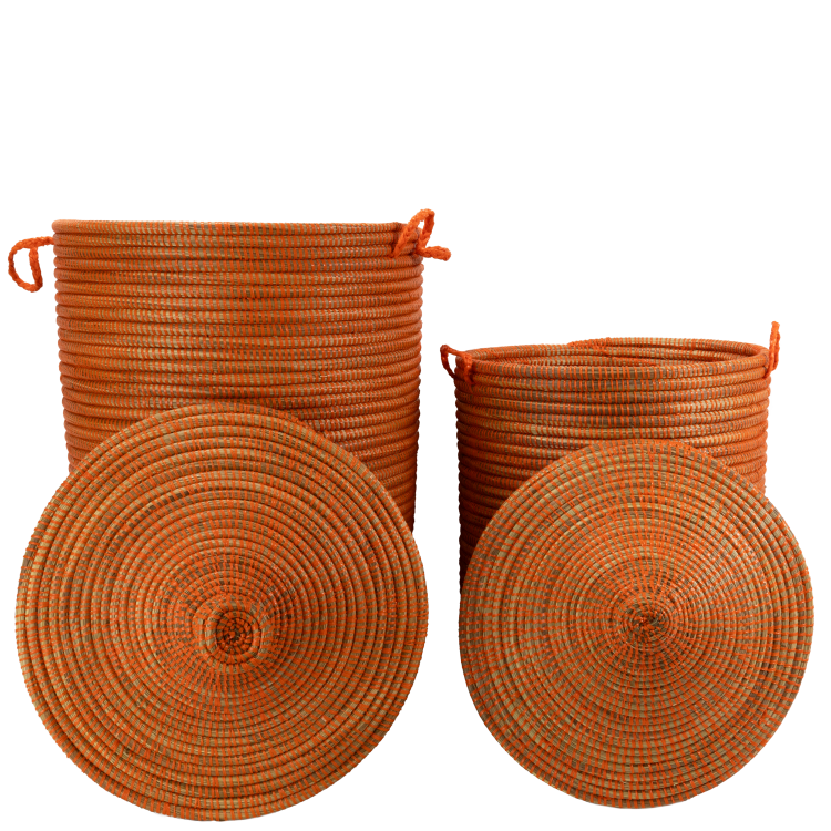 L’ensemble de paniers tajine – Orange se compose de deux grands paniers en osier en forme de tajine authentique. Ils sont tressés à la main par des artisanes sénégalaises, combinant l’osier traditionnel avec de chaudes touches de tissage orange. Le résultat est un ensemble à la fois fonctionnel et très décoratif.
