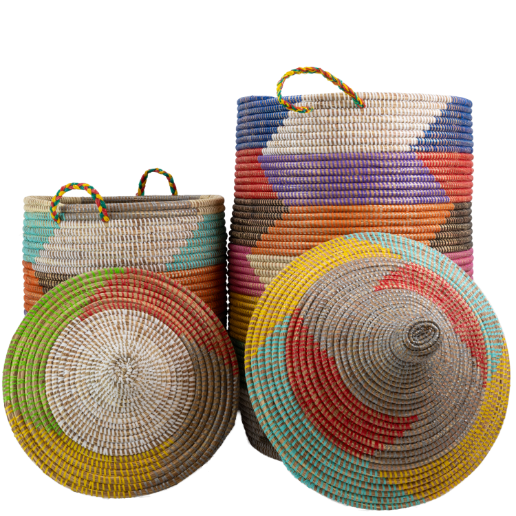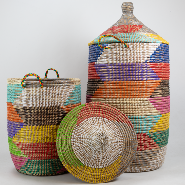 L’ensemble de paniers Tajine – Trapèze coloré combine un authentique savoir-faire sénégalais avec un motif de tressage multicolore et vibrant. L’osier robuste tressé à la main assure une bonne ventilation et garde votre linge frais et sec.