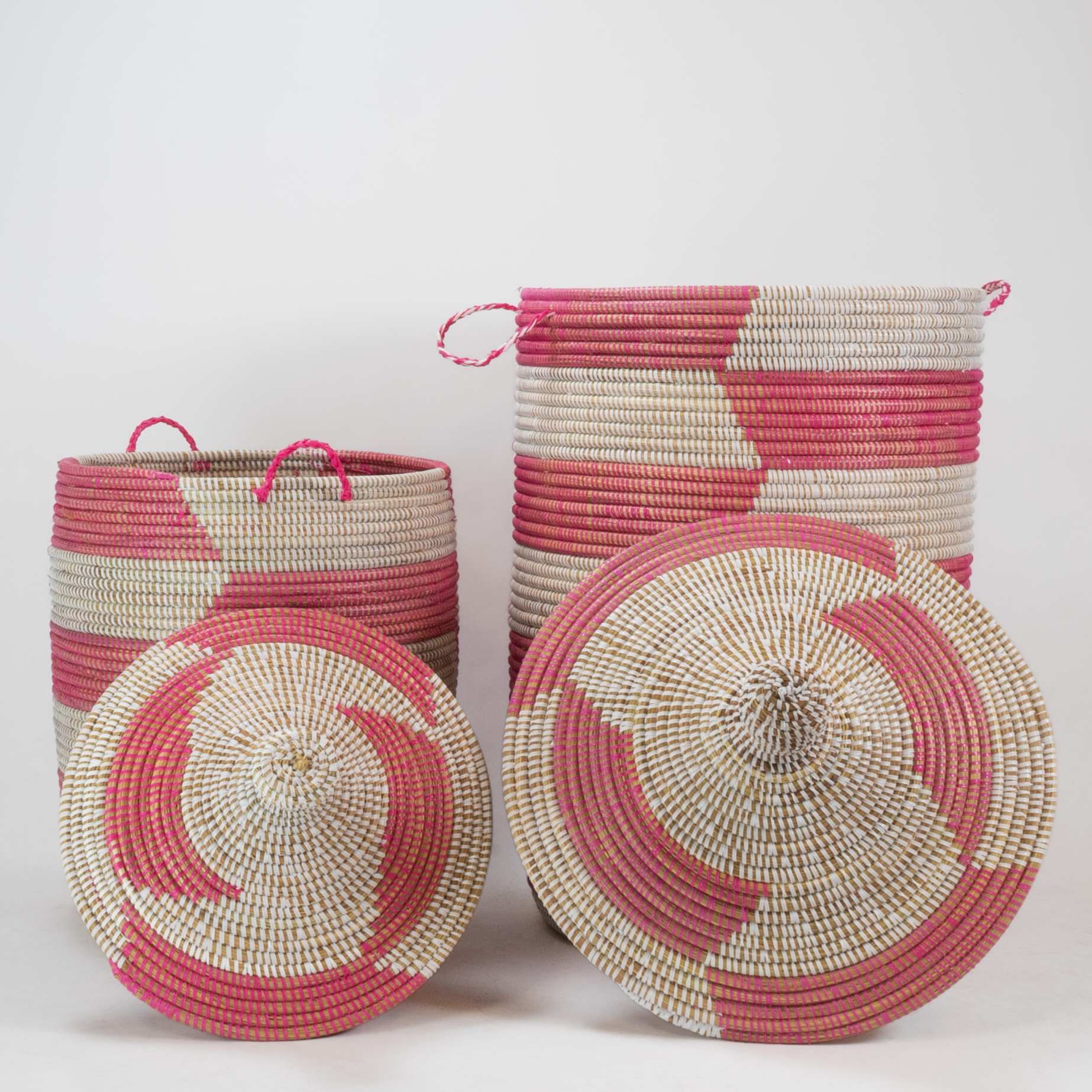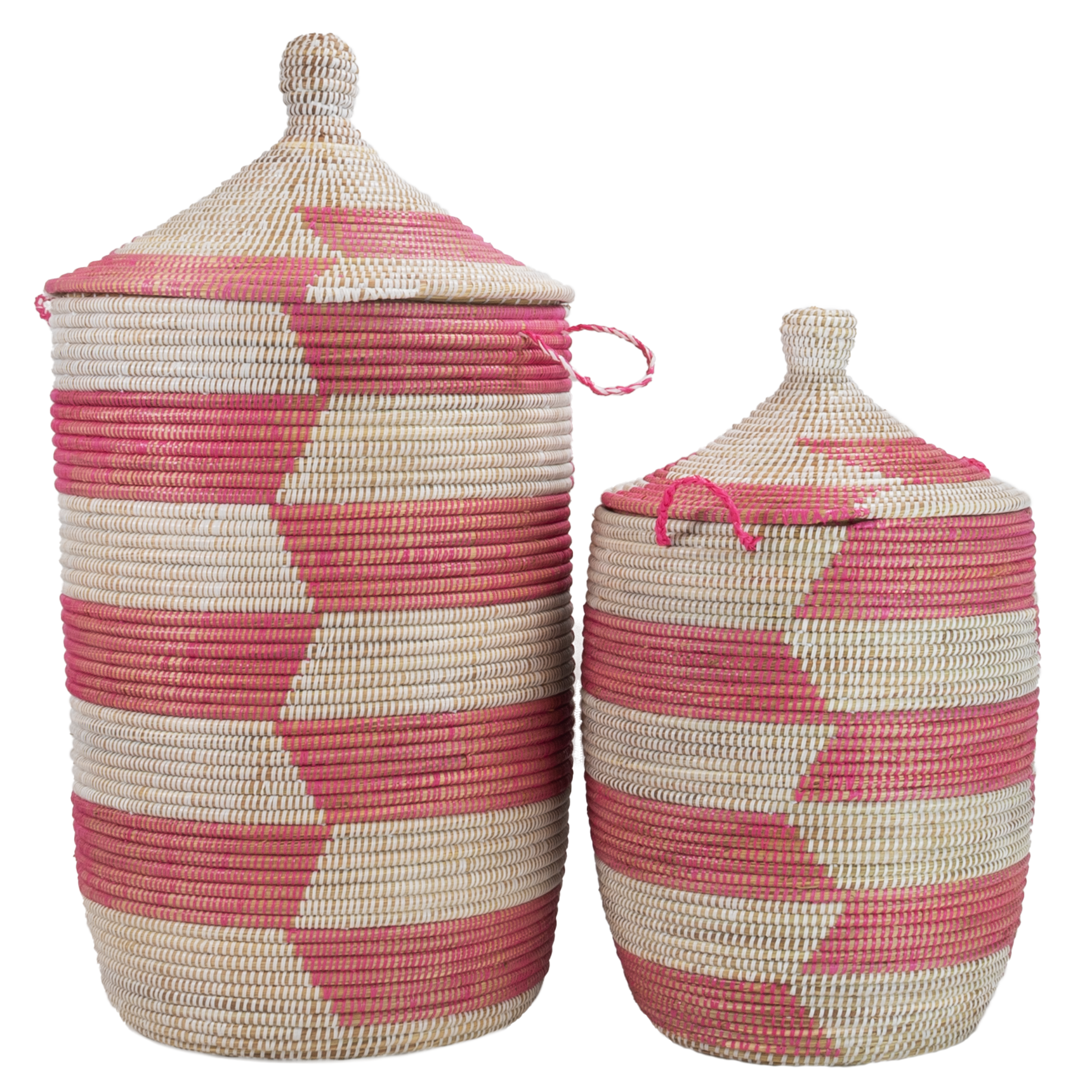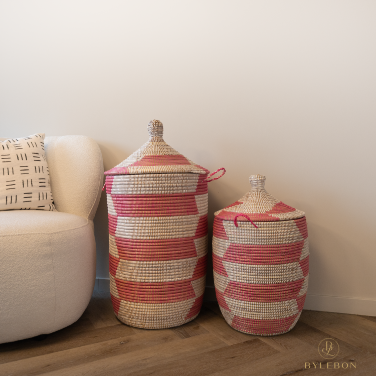 L’ensemble de paniers Tajine – Trapèze Rose combine l’artisanat sénégalais traditionnel avec un motif de vannerie rose moderne et la forme tajine reconnaissable. Le roseau tressé robuste ventile bien et garde votre linge au sec.