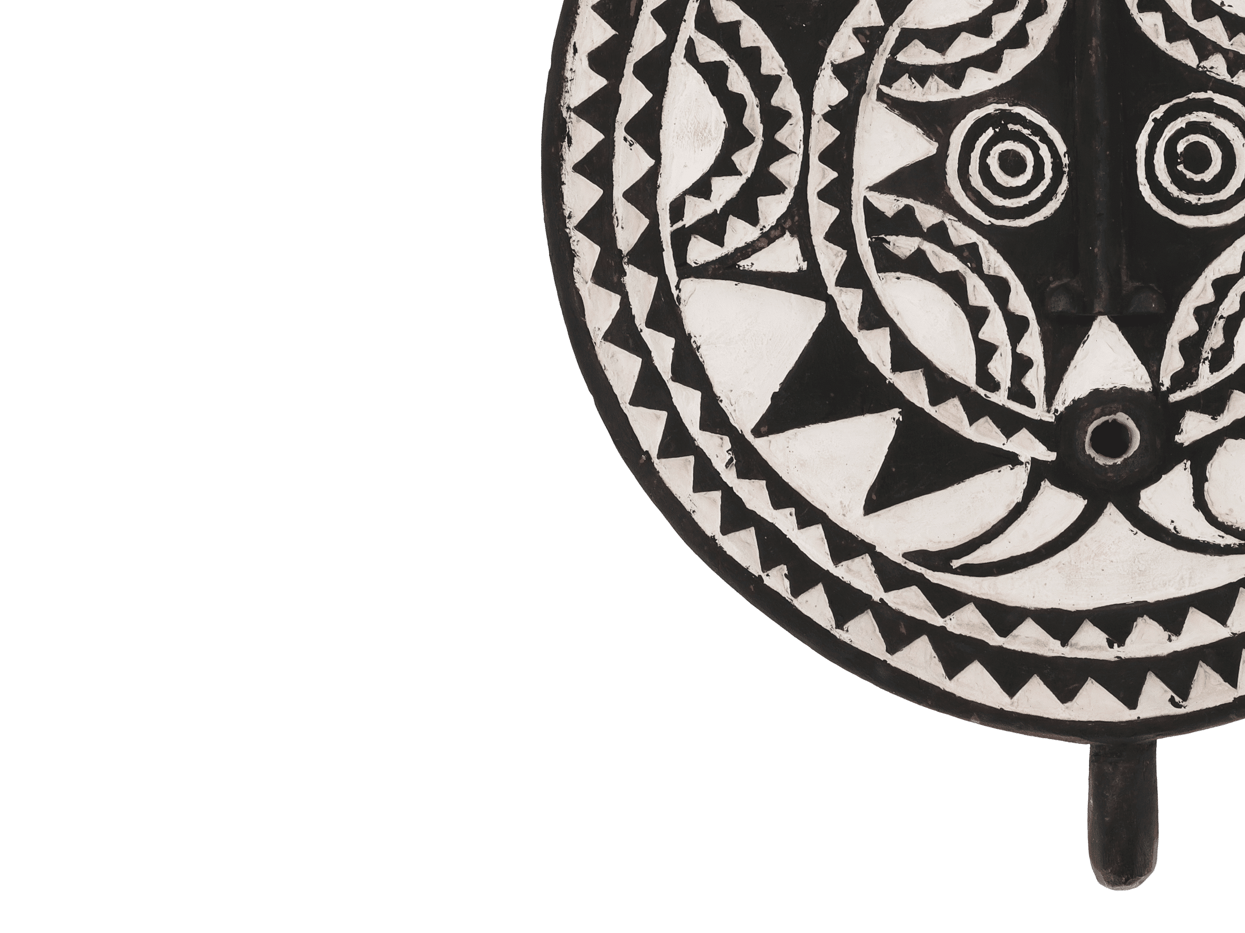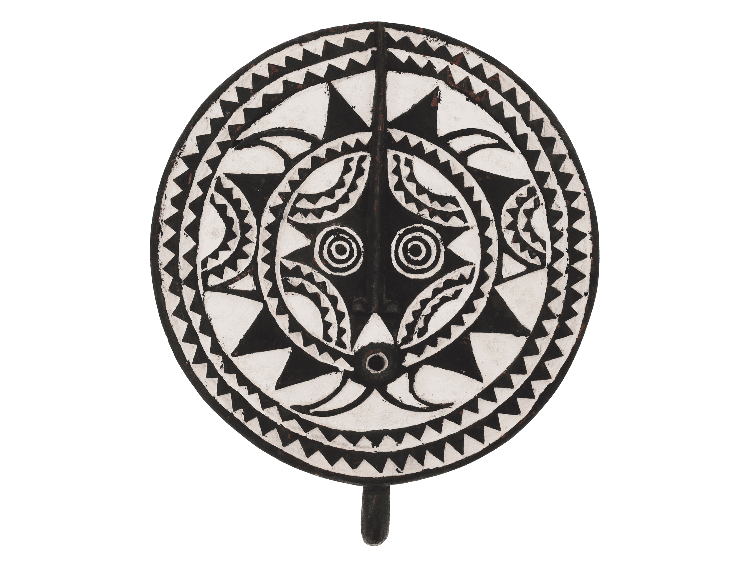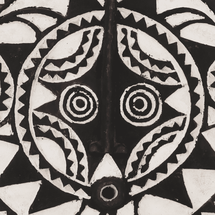 Le masque solaire – Bana, associé à la tribu Bobo, est utilisé lors de rituels de protection ou de purification et lors de funérailles. La tribu Bobo est originaire de Bobo-Dioulasso, au nord-est du Burkina Faso, et de certaines parties du Mali, en Afrique de l’Ouest. Les Bobo croient que le masque protège leur famille et leur village des mauvais esprits et favorise le mariage et la fertilité. Bien que le masque soit appelé « masque solaire », il représente en réalité un animal nocturne, comme un hibou ou un oiseau de nuit, ce qui explique les yeux exorbités et le « nez » en forme de bec.