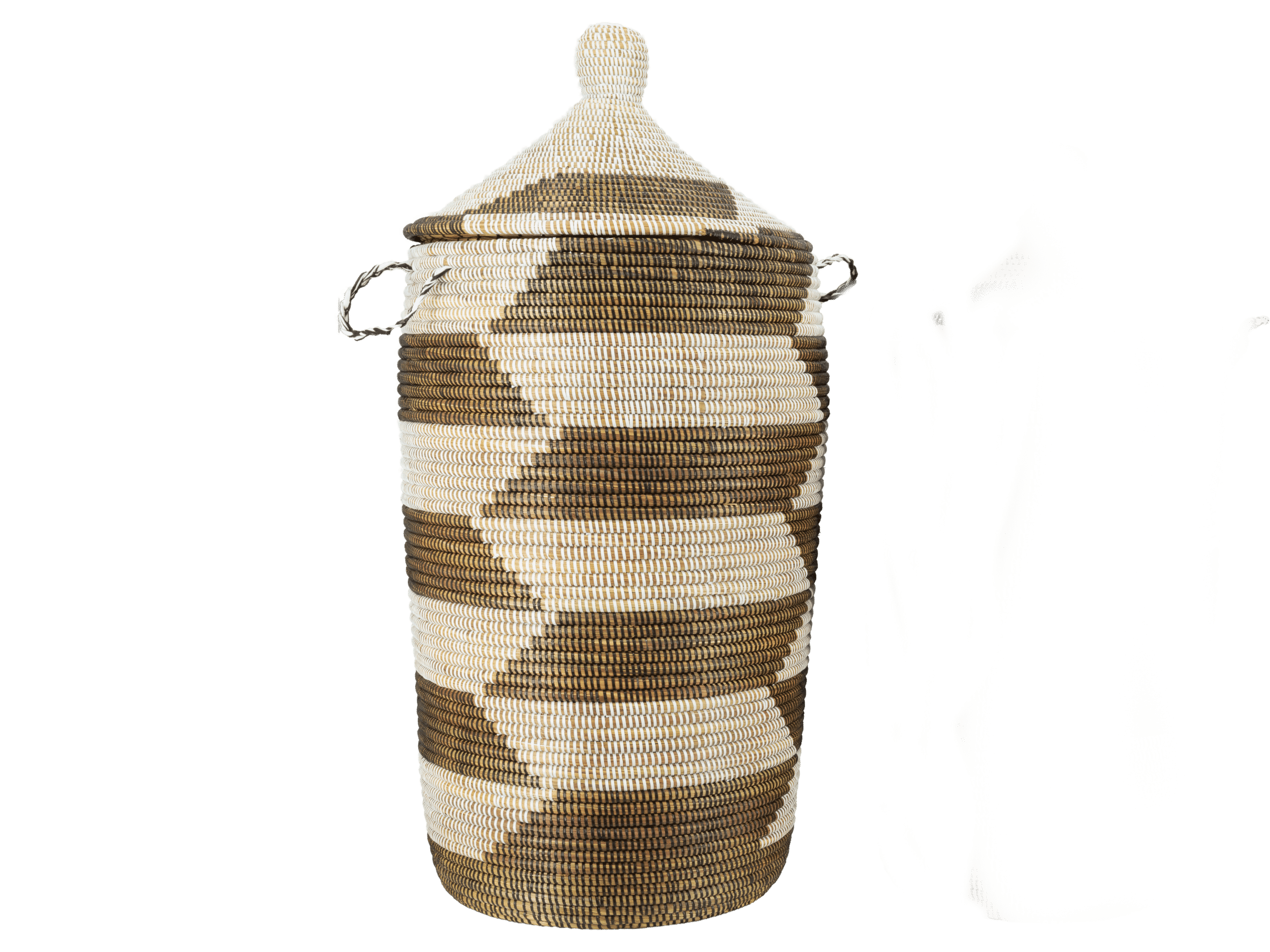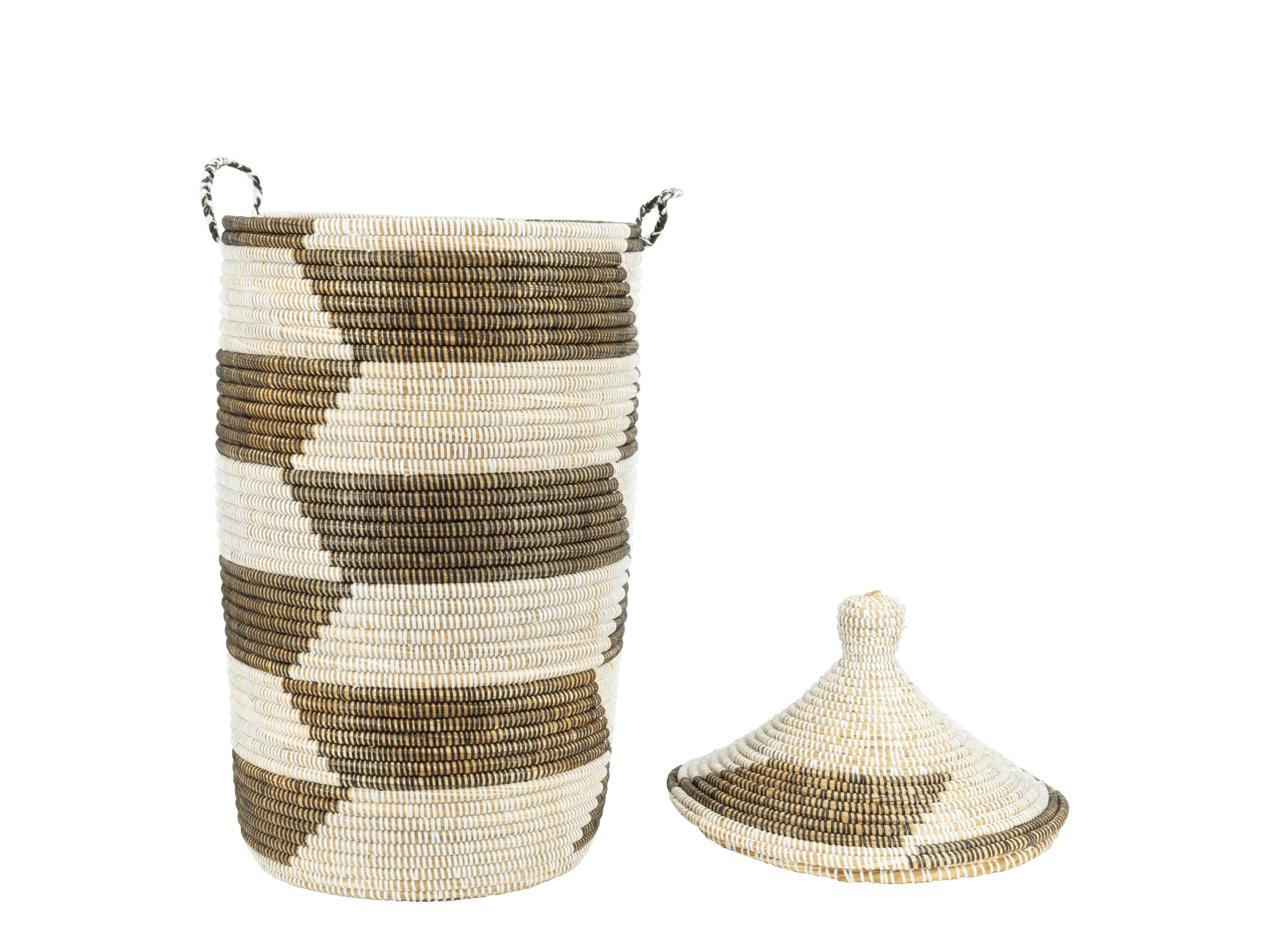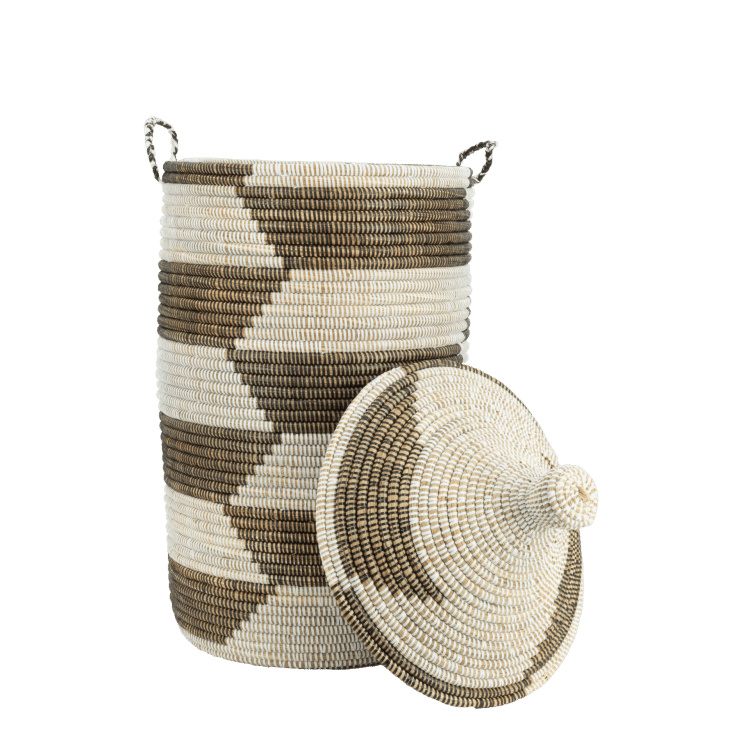 Panier en osier tissé à la main avec couvercle tajine et motif trapèze. Pour le linge, les plaids ou les jouets. Équipé de poignées latérales. Fabriqué en osier durable avec des accents recyclés. Les dimensions peuvent varier légèrement en raison de sa fabrication artisanale.