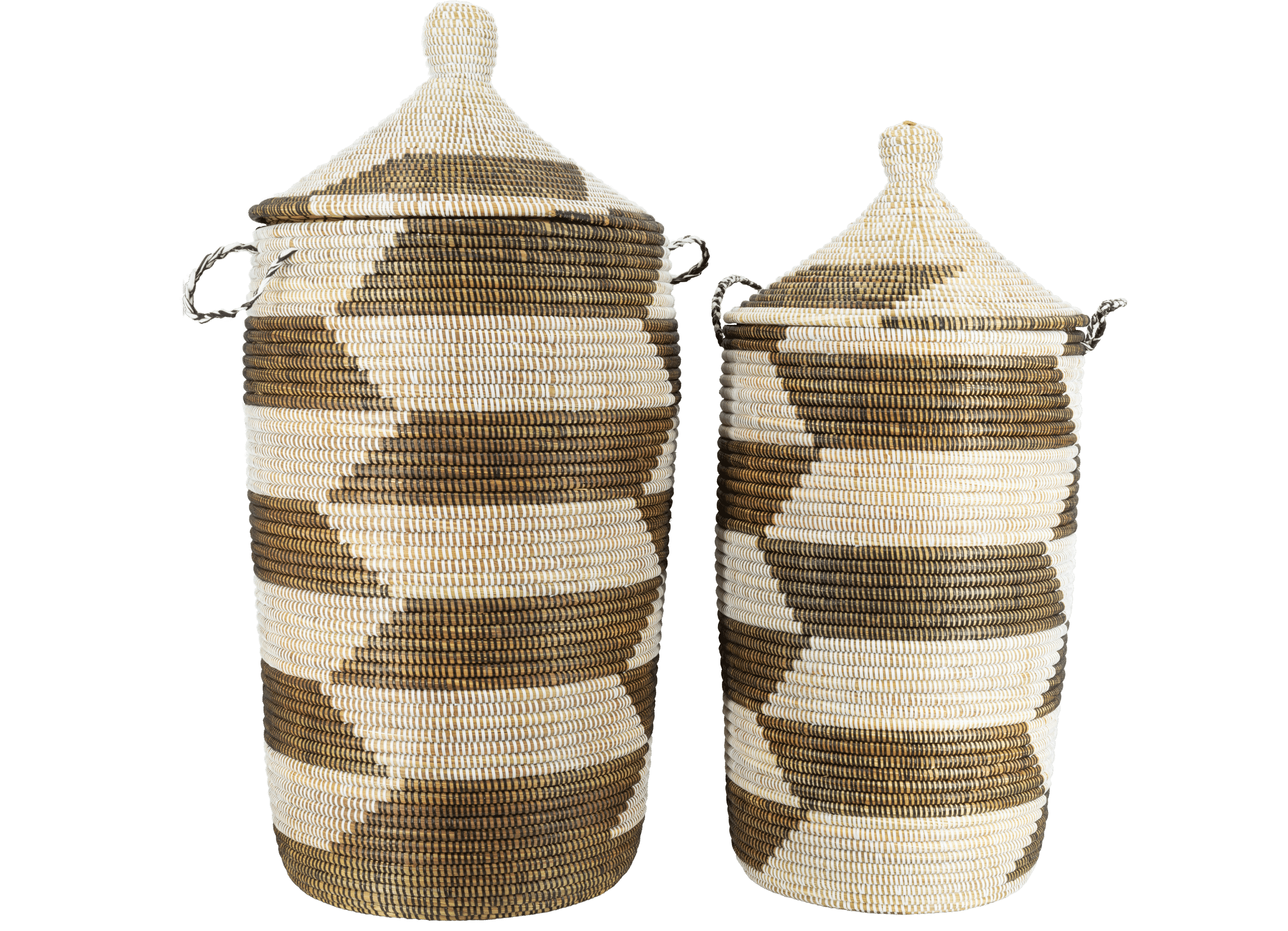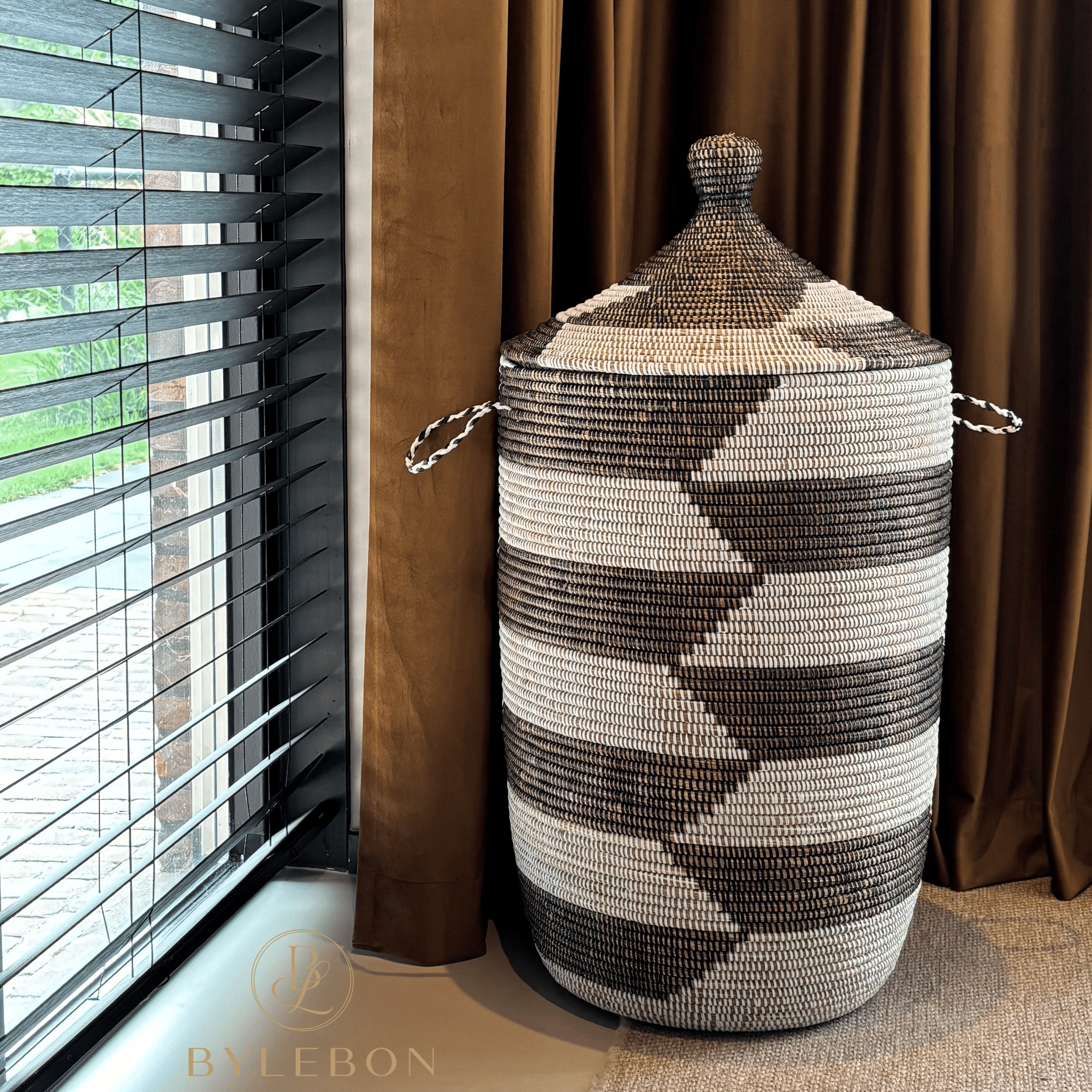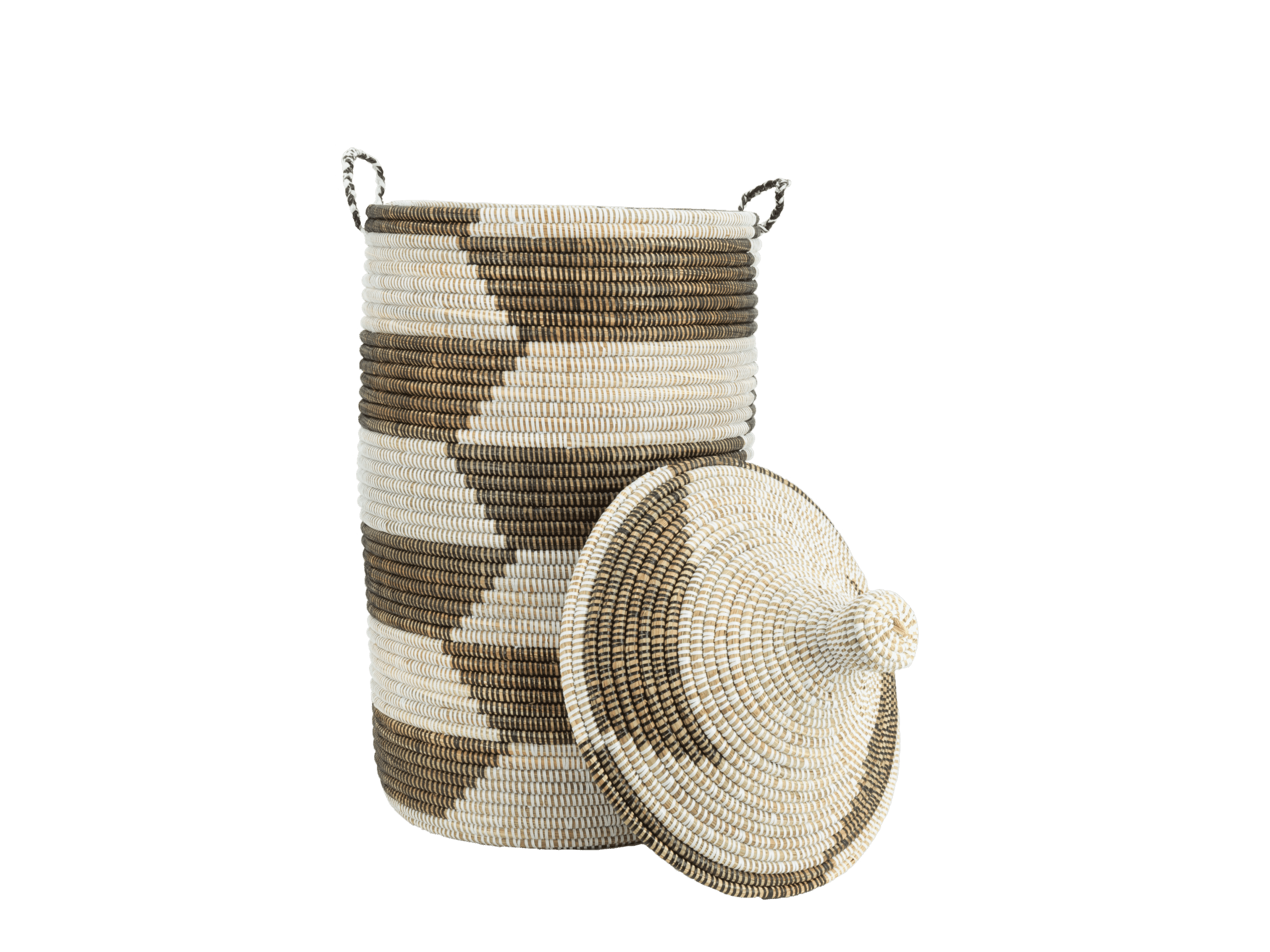 Panier en osier tissé à la main avec couvercle tajine et motif trapèze. Pour le linge, les plaids ou les jouets. Équipé de poignées latérales. Fabriqué en osier durable avec des accents recyclés. Les dimensions peuvent varier légèrement en raison de sa fabrication artisanale.