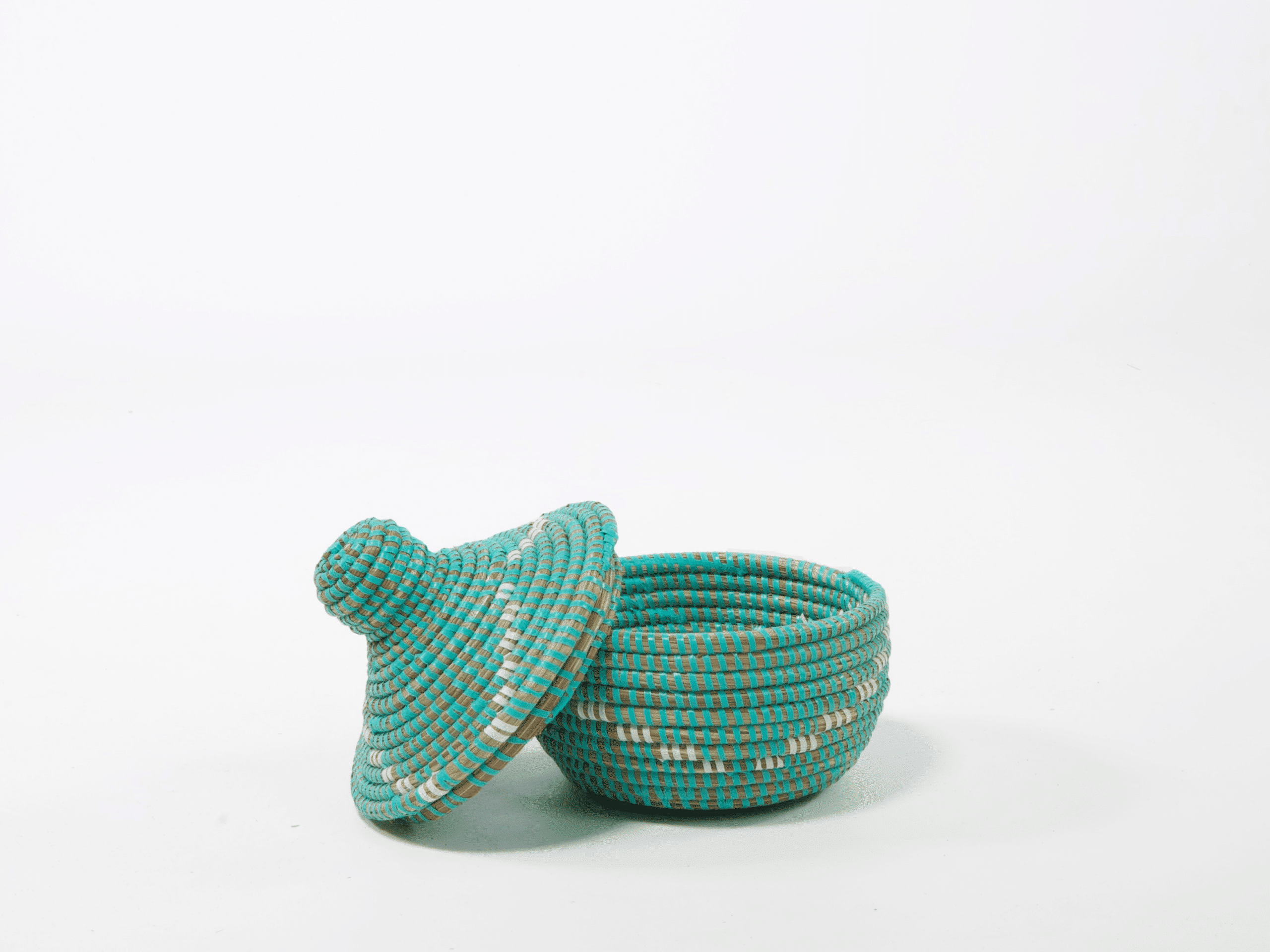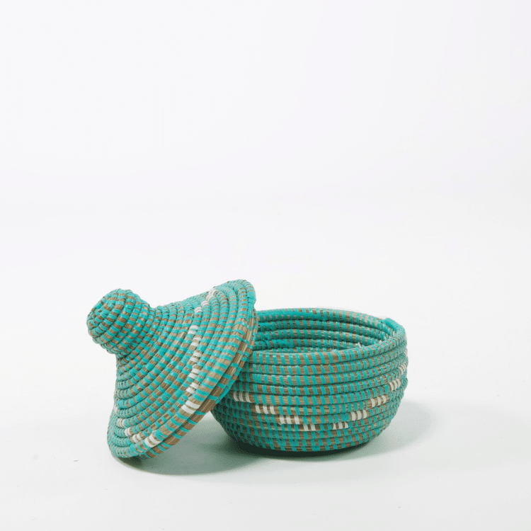 Le panier Tajine XS – Turquoise est un magnifique panier fait à la main au Sénégal, avec une forme de tajine unique. Avec ses tons turquoise frais et son motif subtil, ce panier est une solution élégante pour ranger de petits objets. Parfait pour ceux qui souhaitent combiner fonctionnalité et esthétique.
