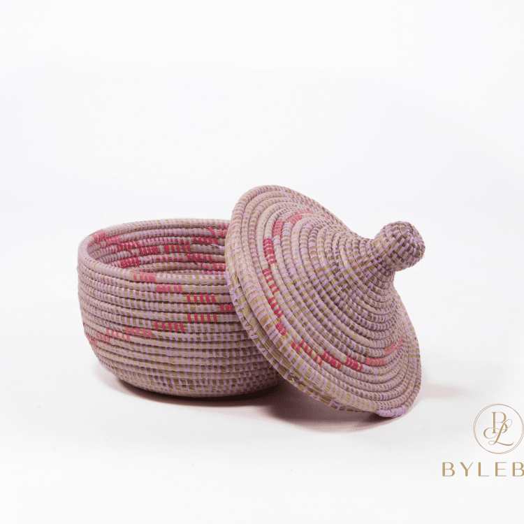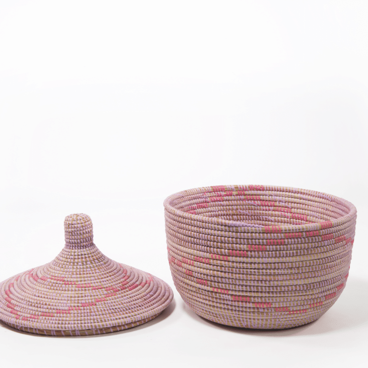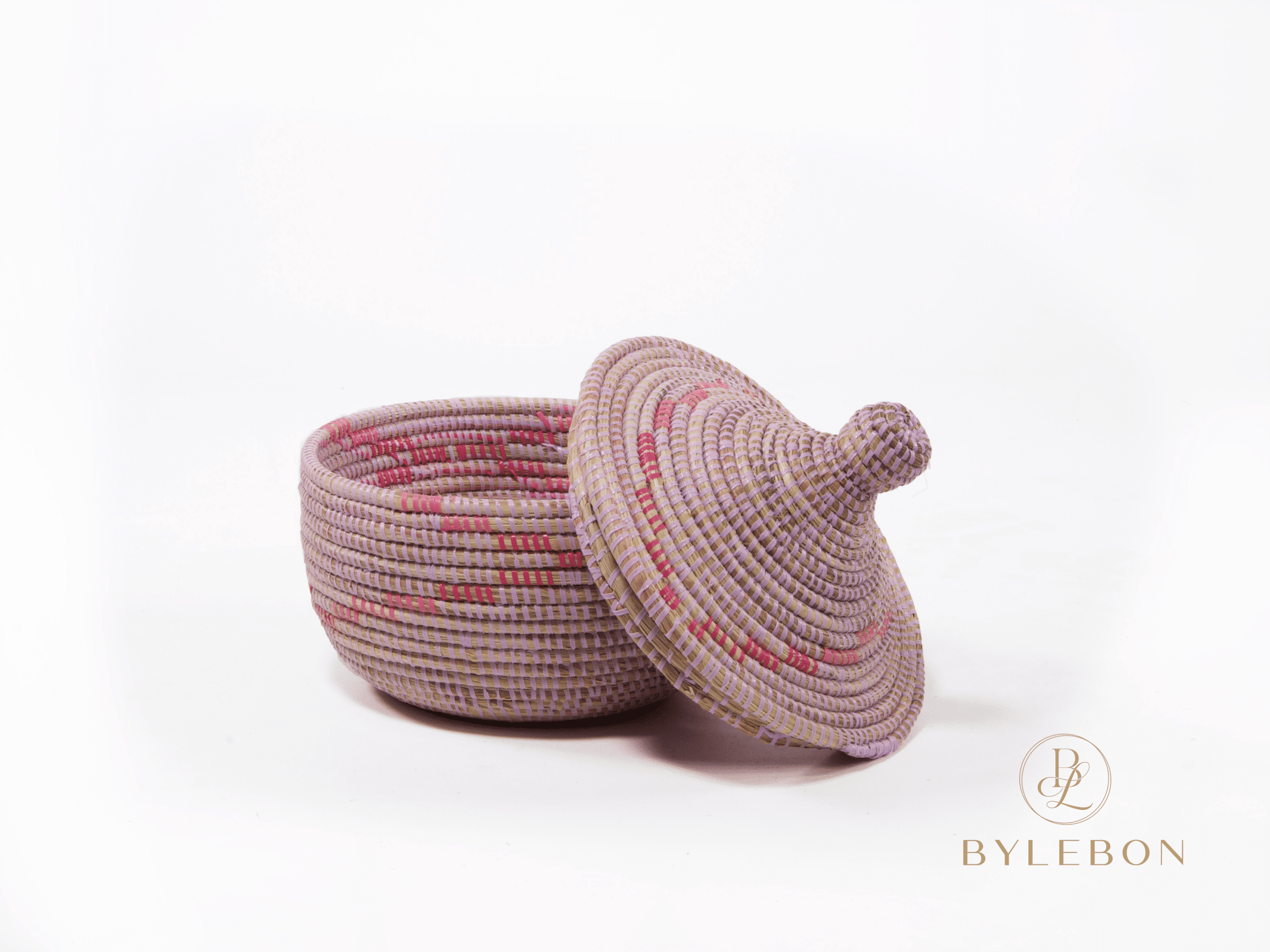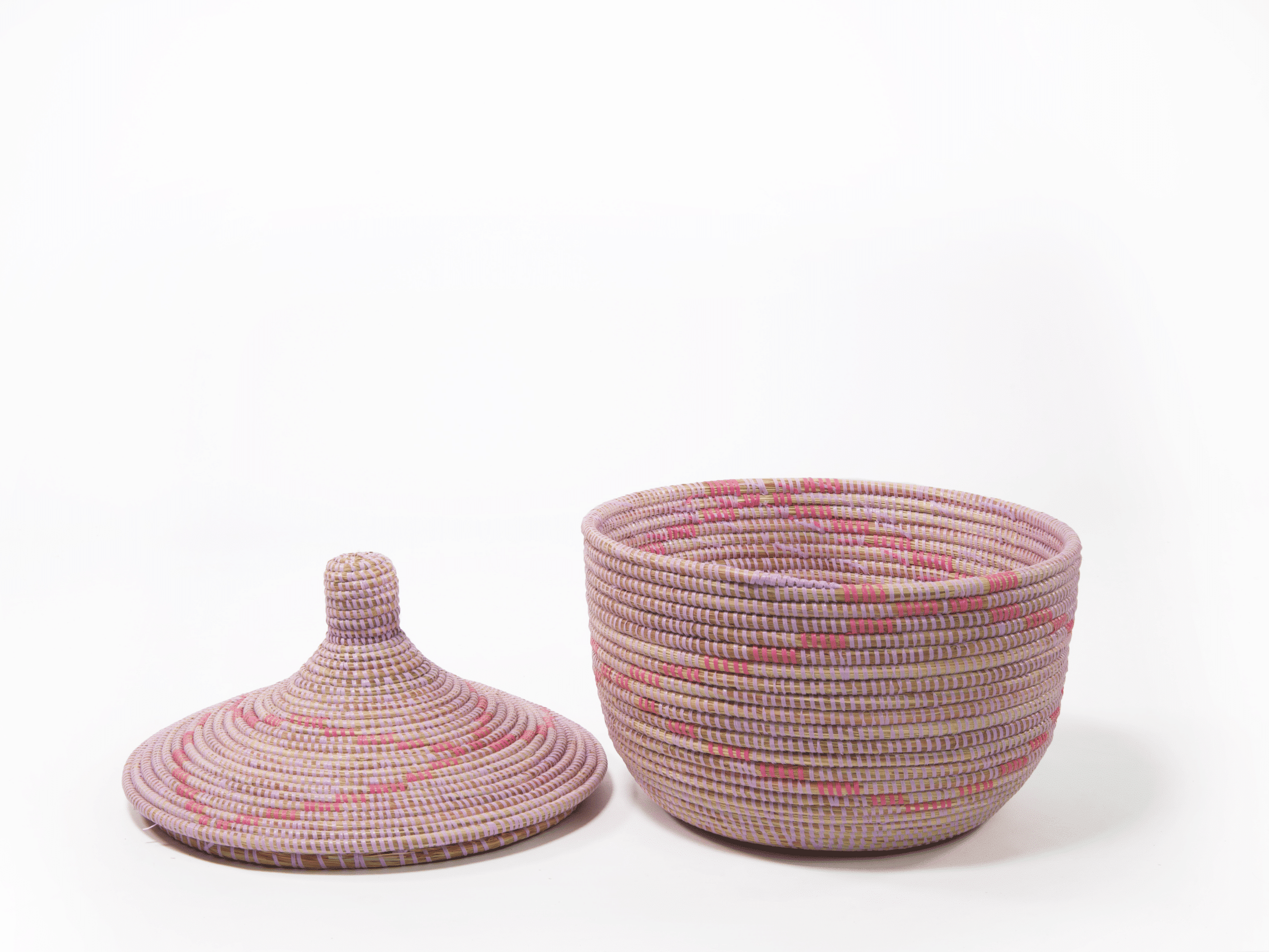 Petit panier tajine – Lila fait main du Sénégal en petit format. Lila/rose avec un subtil motif rouge, idéal pour ranger des accessoires ou comme élément décoratif dans la maison.