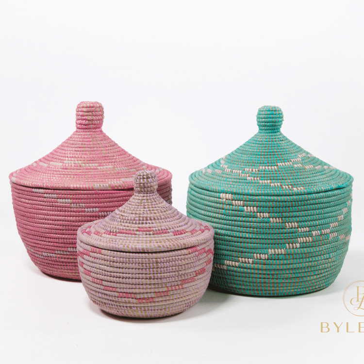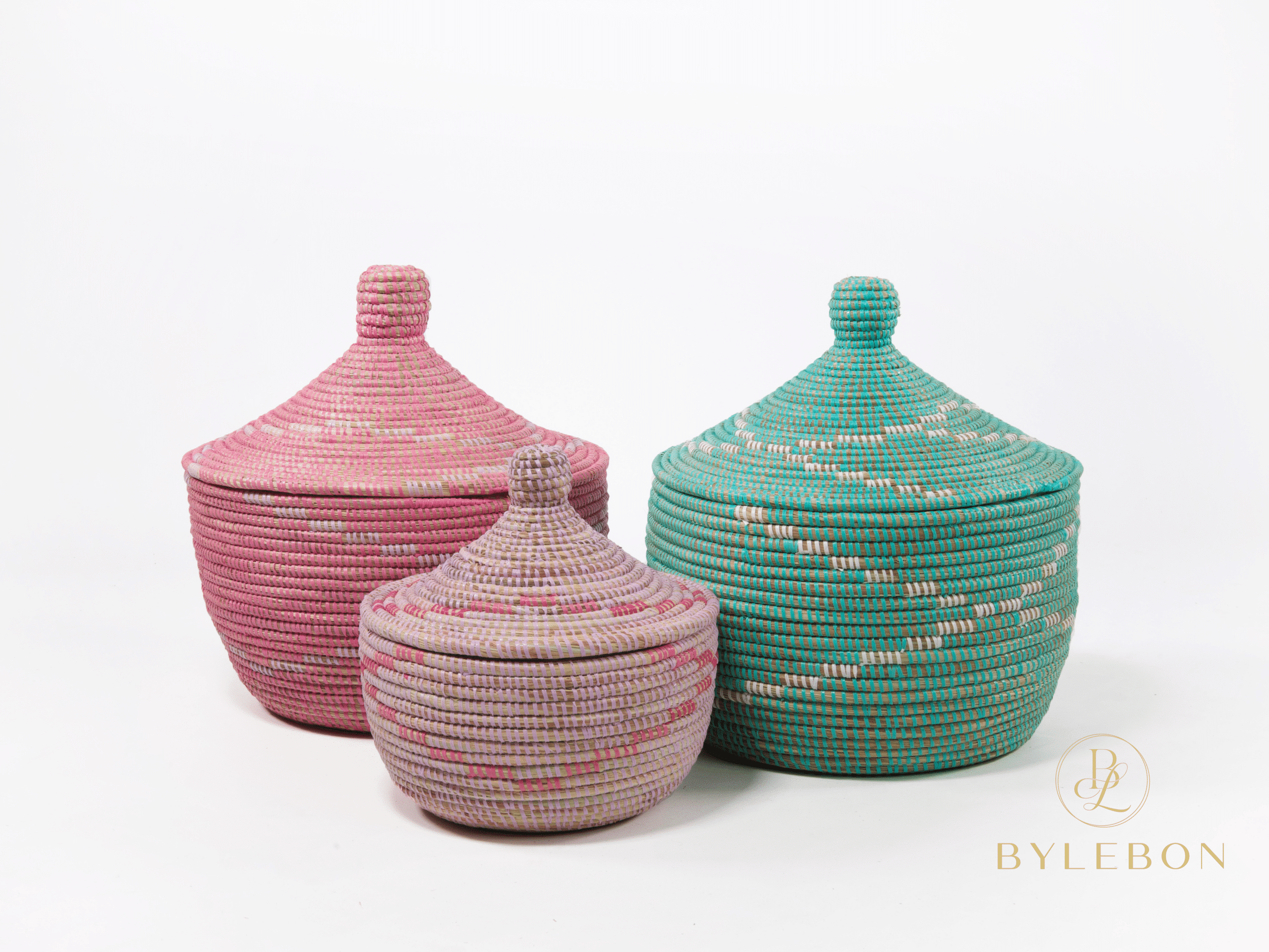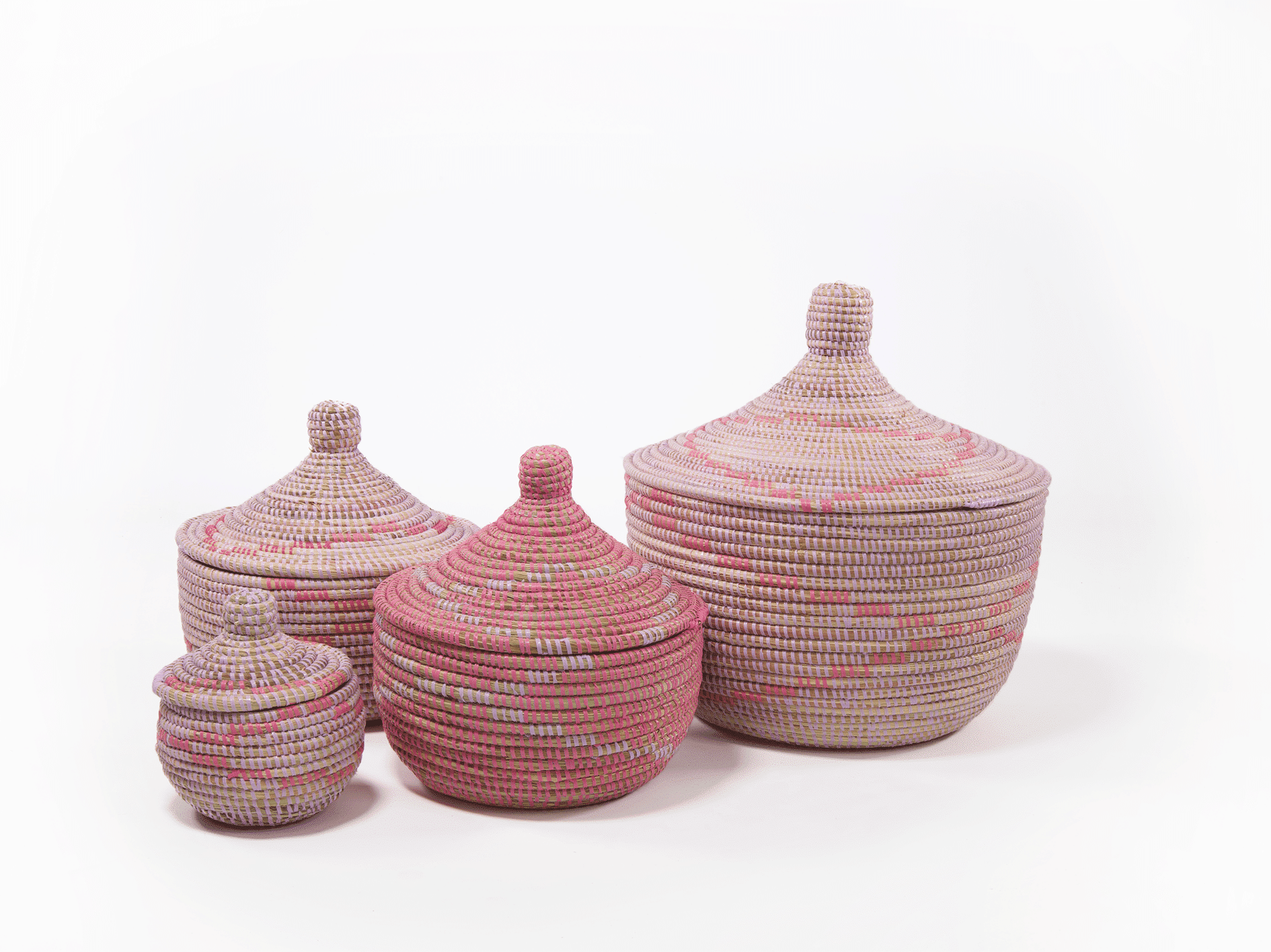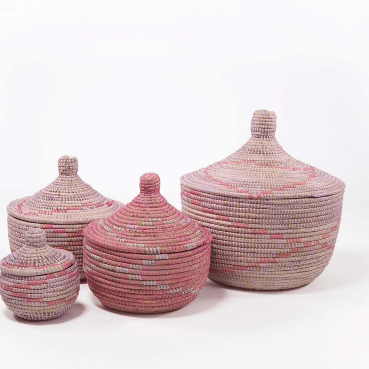 Petit panier tajine – Lila fait main du Sénégal en petit format. Lila/rose avec un subtil motif rouge, idéal pour ranger des accessoires ou comme élément décoratif dans la maison.