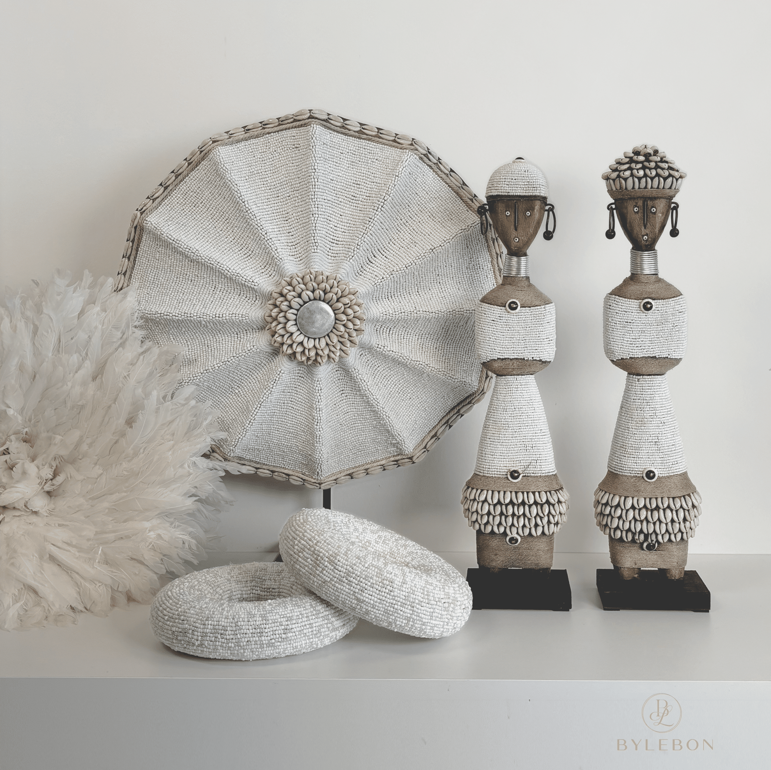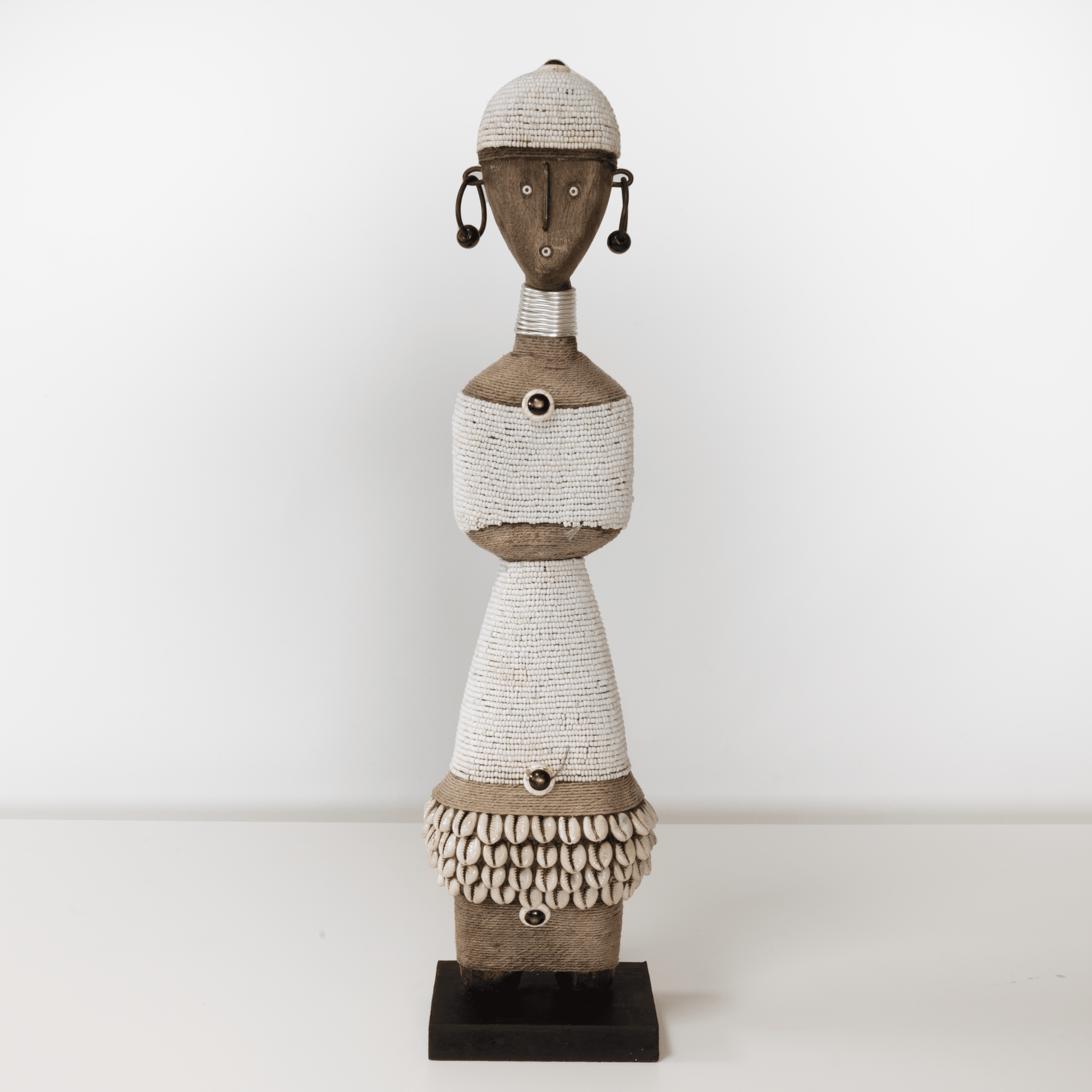 La grande poupée Namji – A4 (Blanc) est fabriquée à la main et décorée de cauris, de perles, de corde et d’éléments métalliques. Ce symbole unique de bonheur et de fertilité est un élément de décoration élégant et un cadeau spécial.