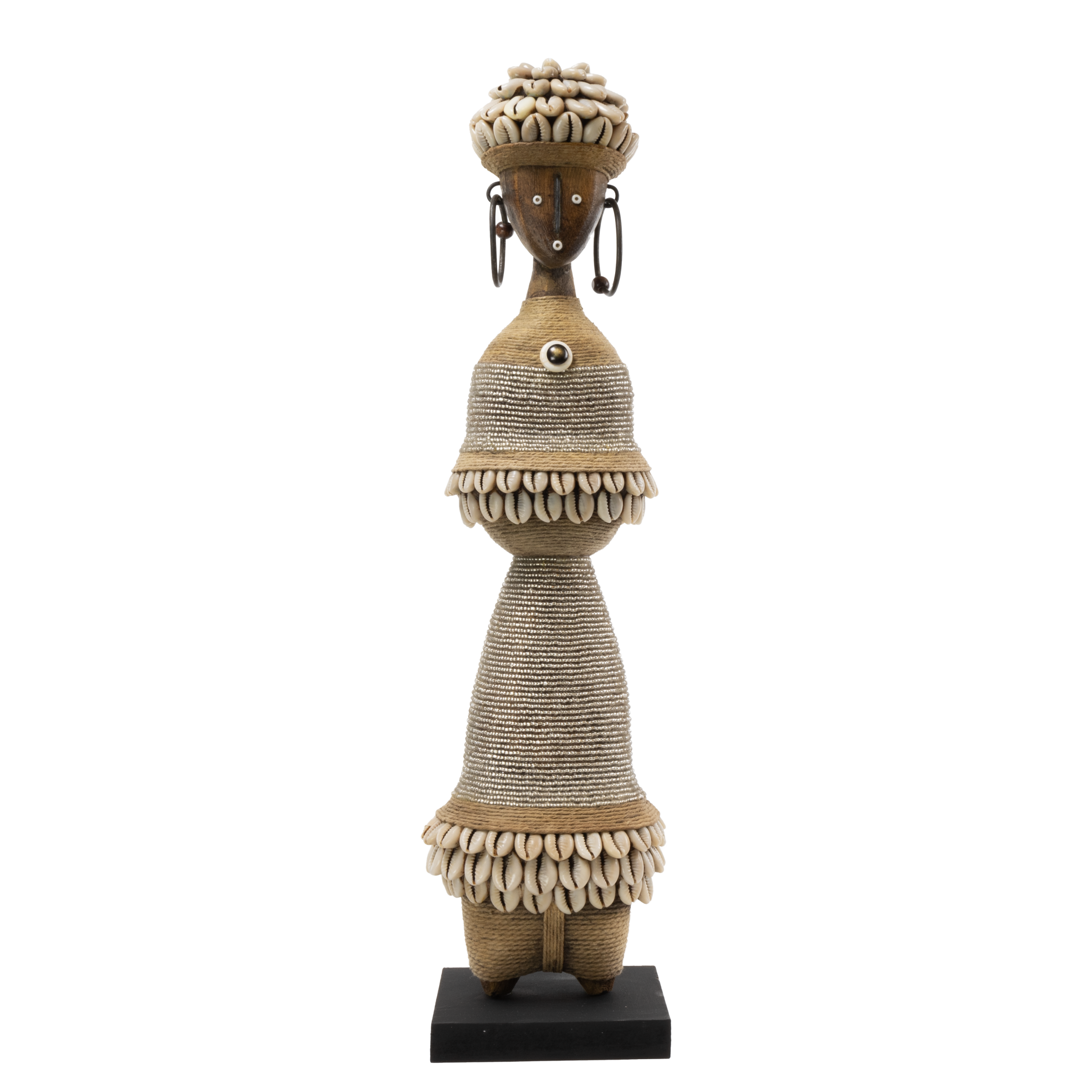 Poupée Namji extra large faite à la main d’environ 43 cm, richement décorée de coquillages cauris, de perles, de corde et de détails métalliques. Une pièce de décoration culturelle unique avec du caractère.