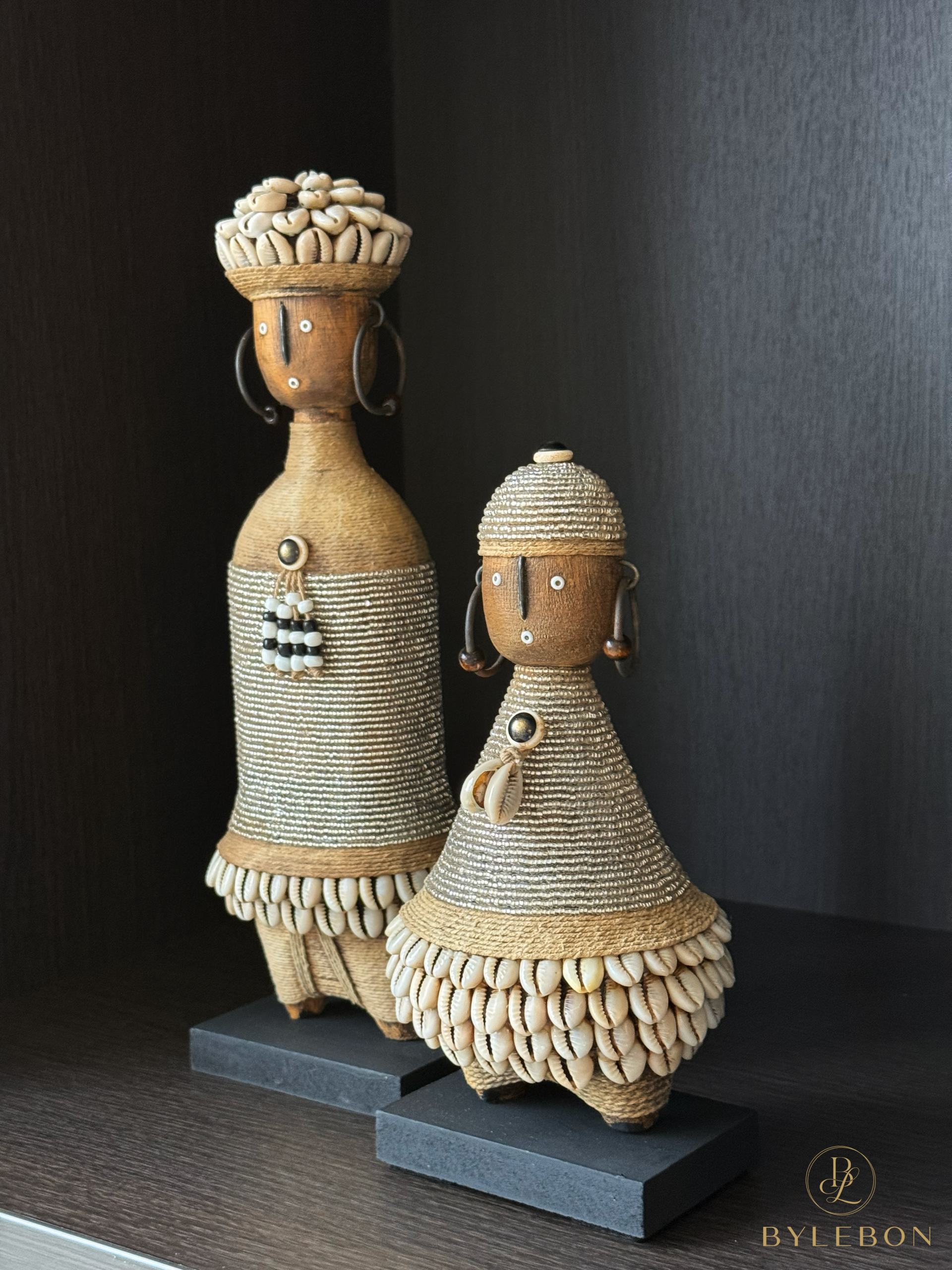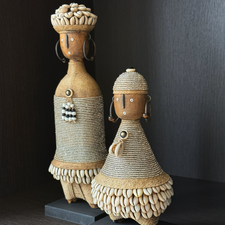 Cette poupée Namji – B1, avec ses 22 cm de hauteur environ, est plus compacte et parfaite pour les buffets, les étagères murales ou les petites bibliothèques. La Namji a un corps conique caractéristique, un perlage étroitement enfilé et un bord richement fini avec des coquillages cauris.