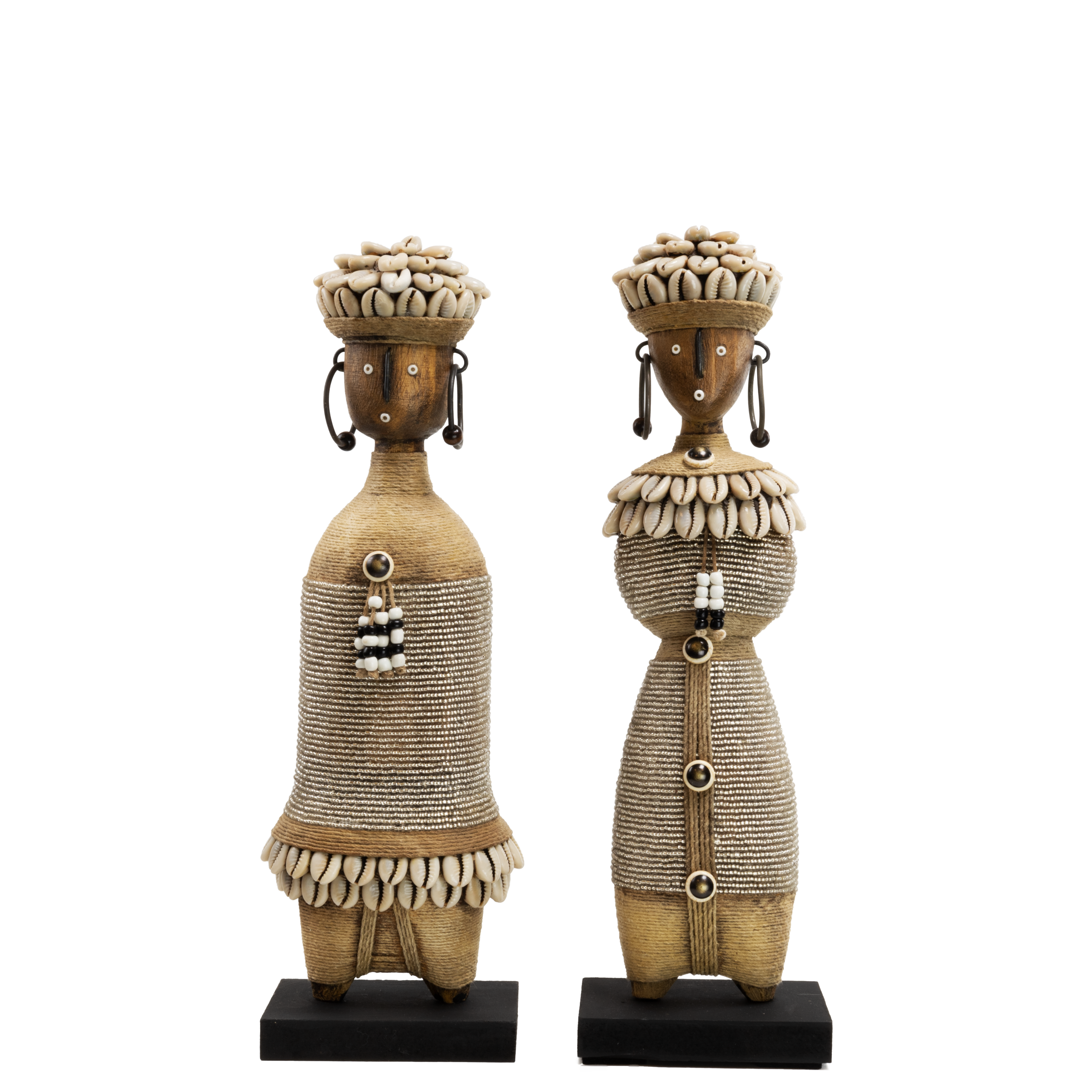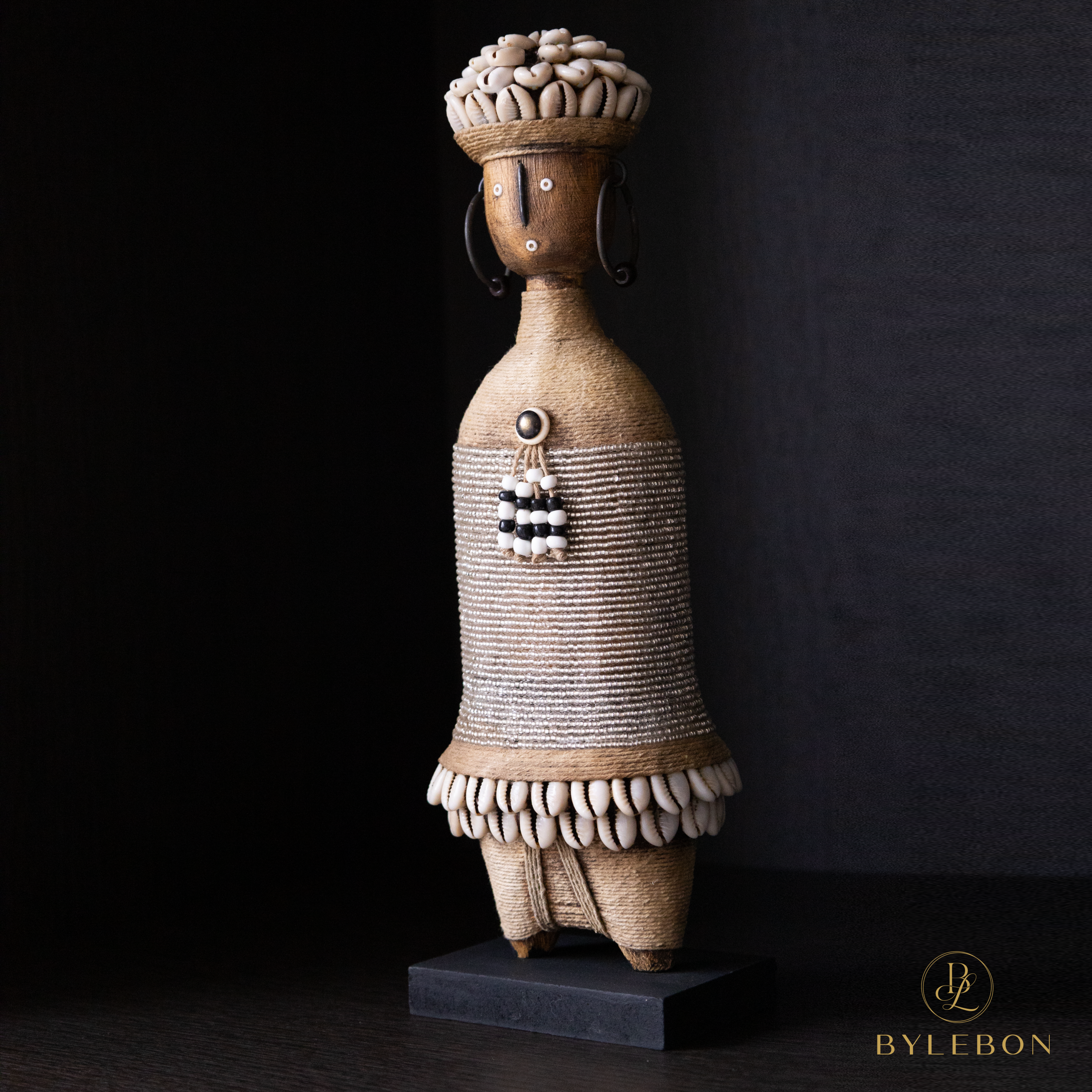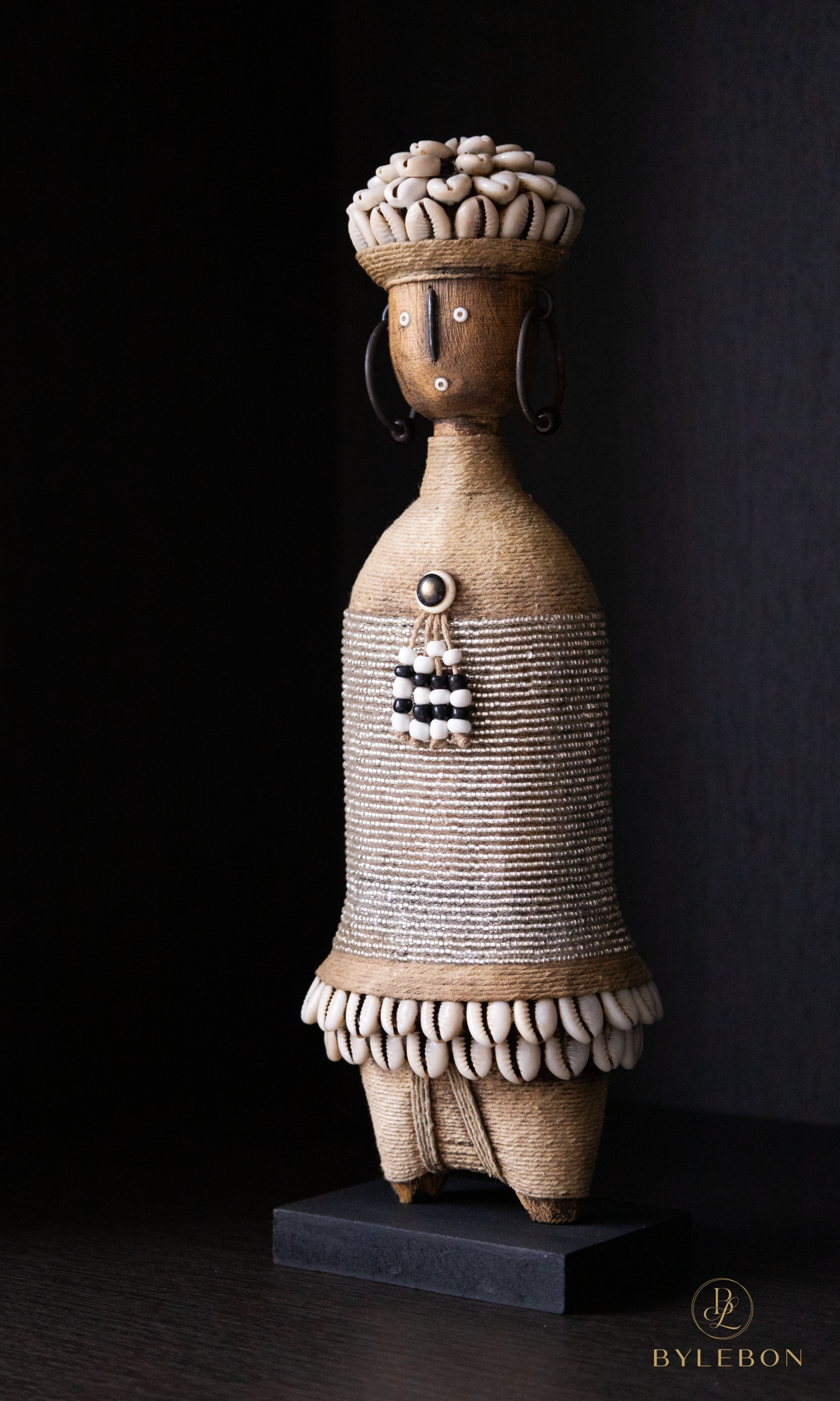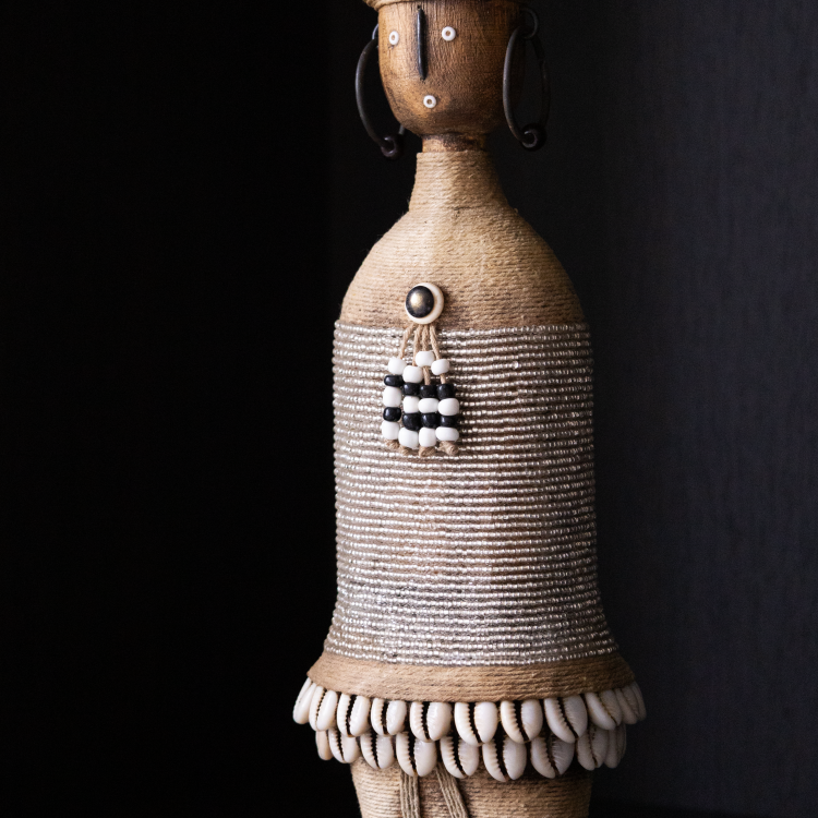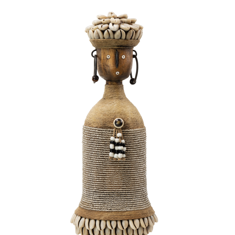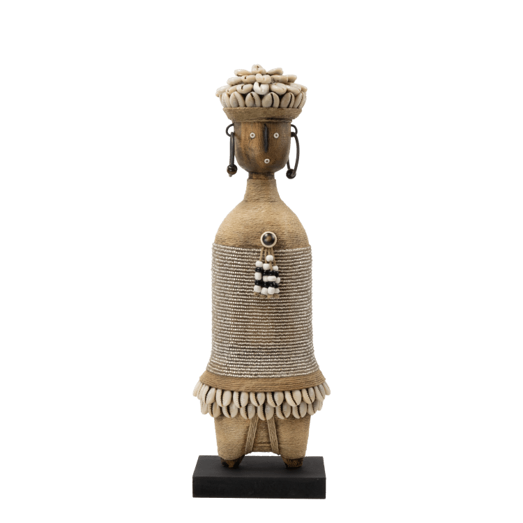 Poupée Namji – D2 authentique d’environ 34 cm. Dotée d’un cordage élégant, de coquillages cauris et de détails de perles subtils sur un socle noir robuste. Une magnifique pièce de décoration unique avec des tons terreux chauds et une finition traditionnelle.