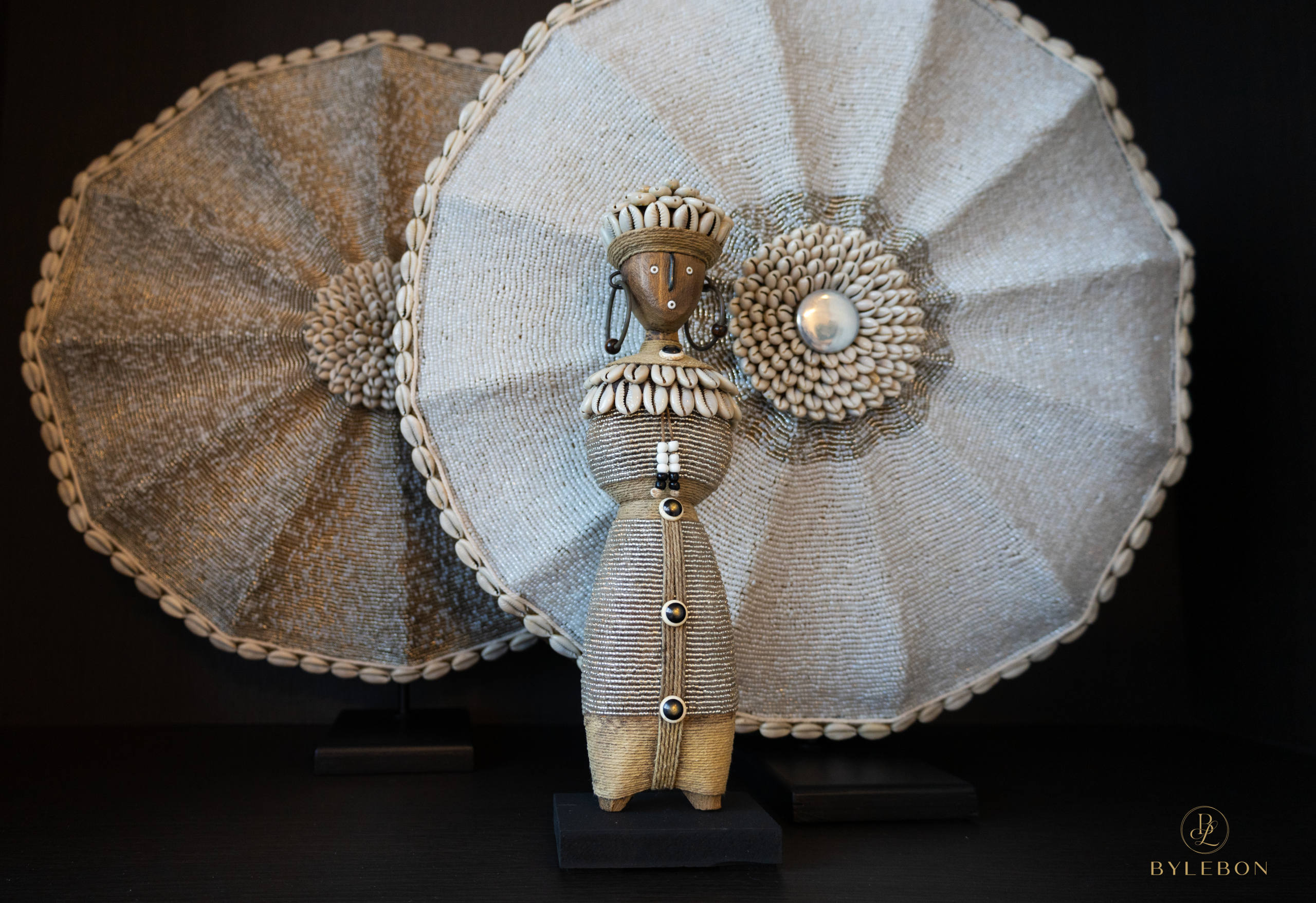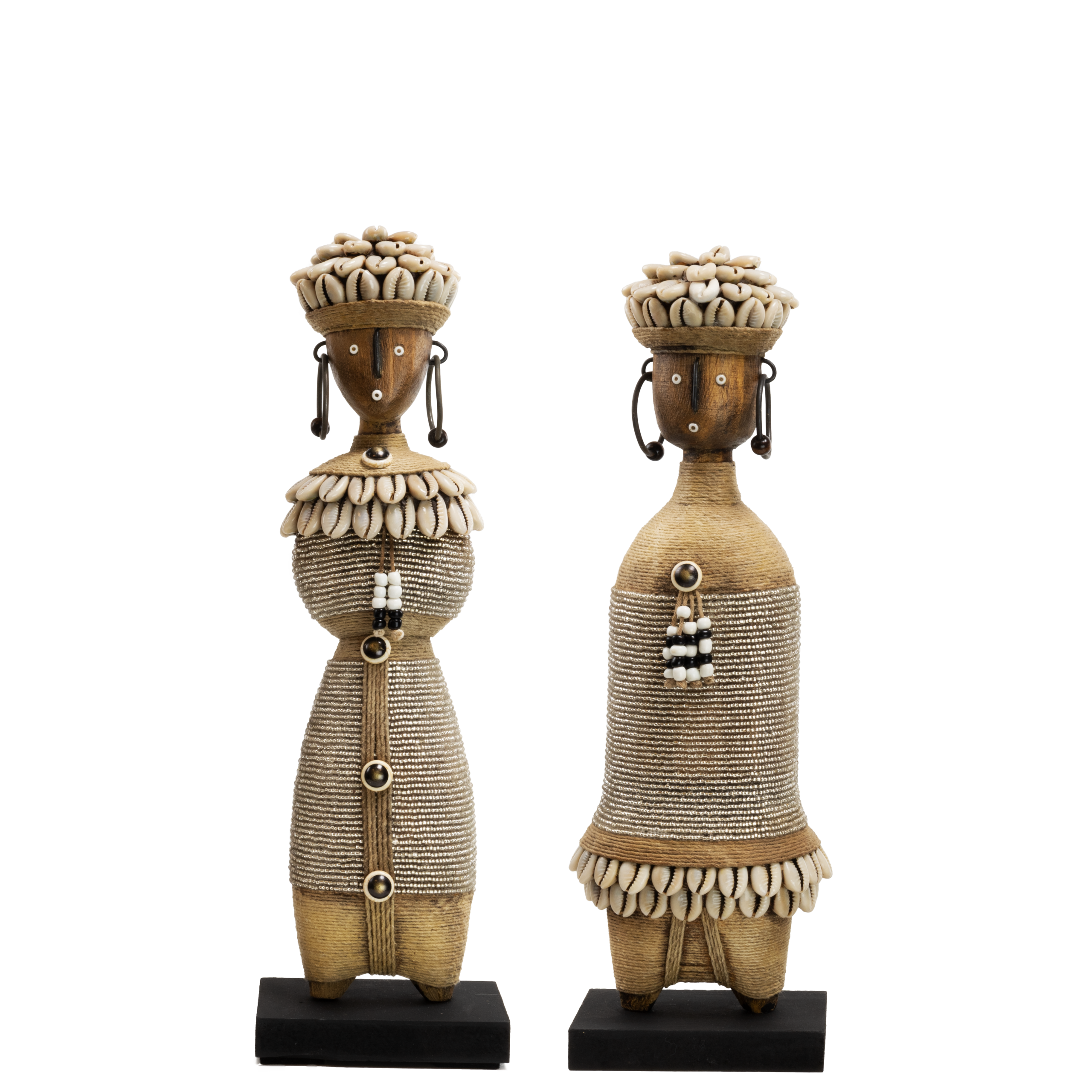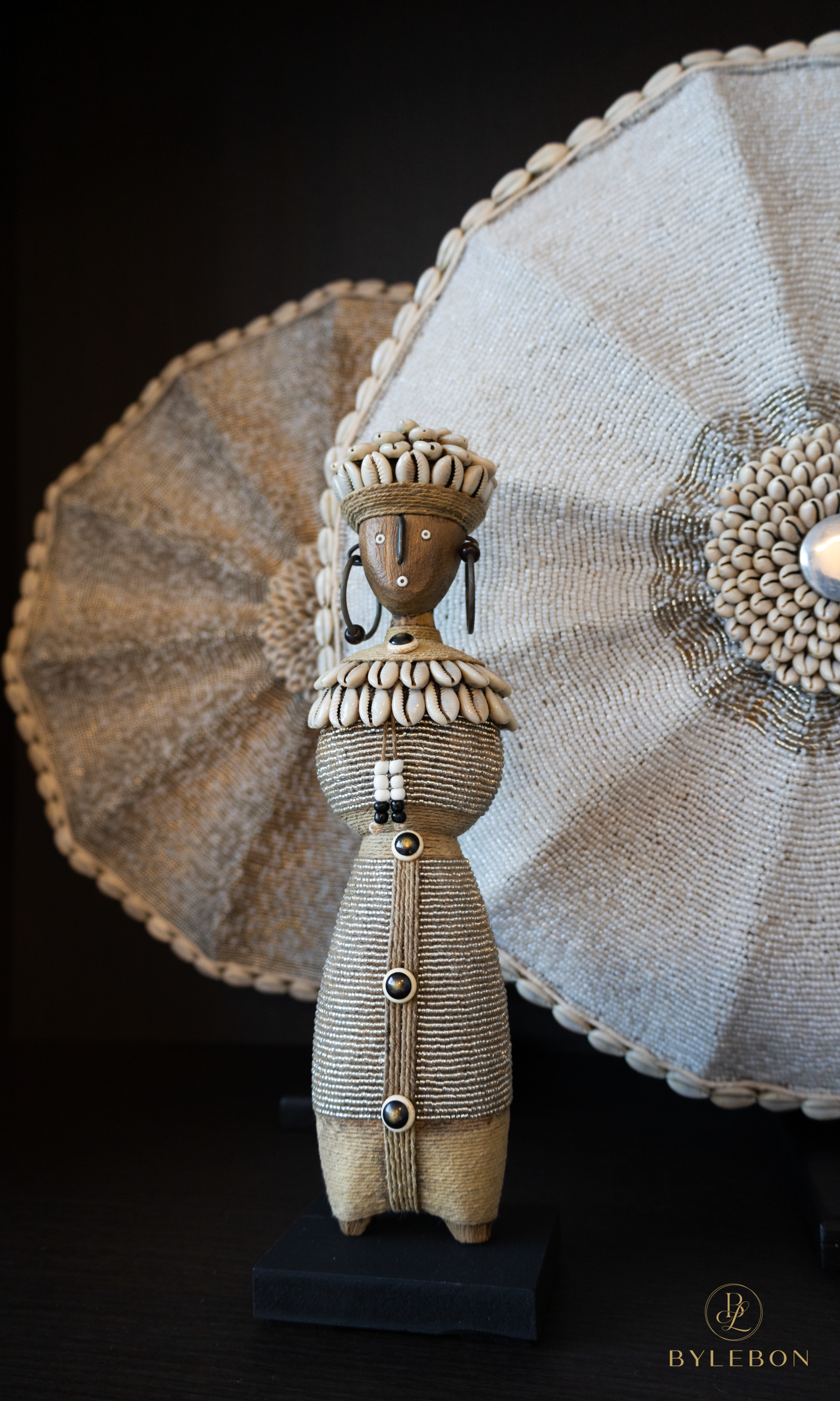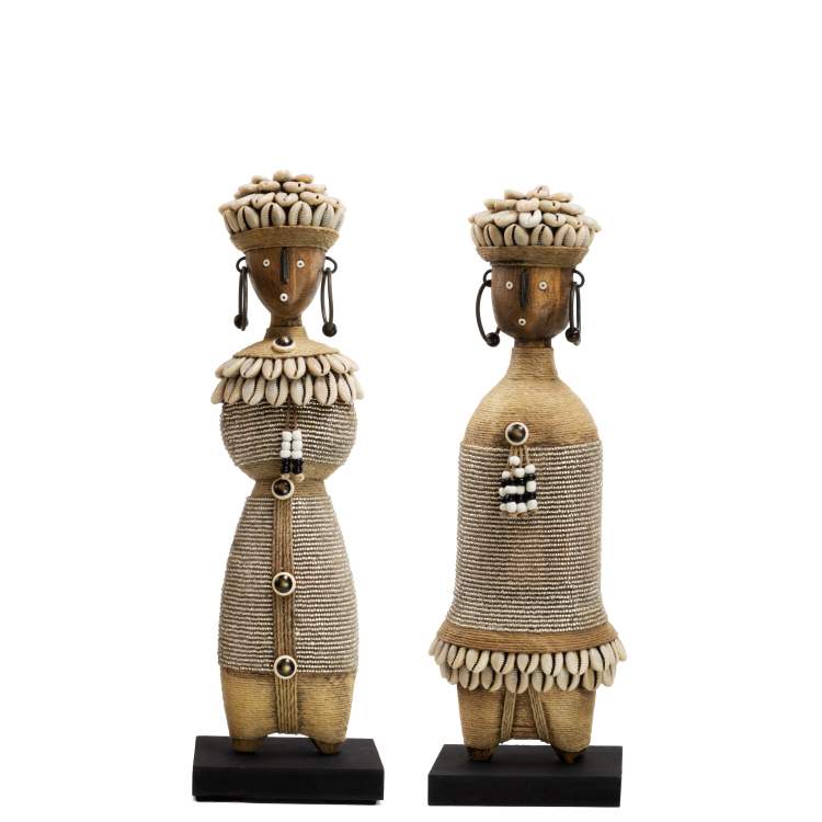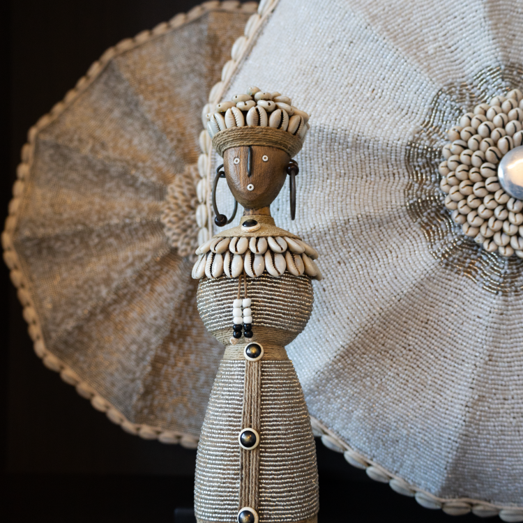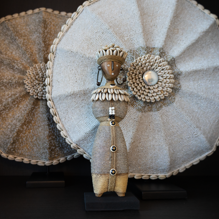 Cette poupée Namji faite à la main (modèle de taille moyenne) est une pièce décorative unique du Cameroun. La statue est ornée de perles transparentes, de coquillages cauris, de corde et de subtils détails métalliques. La poupée repose solidement sur une plateforme noire.