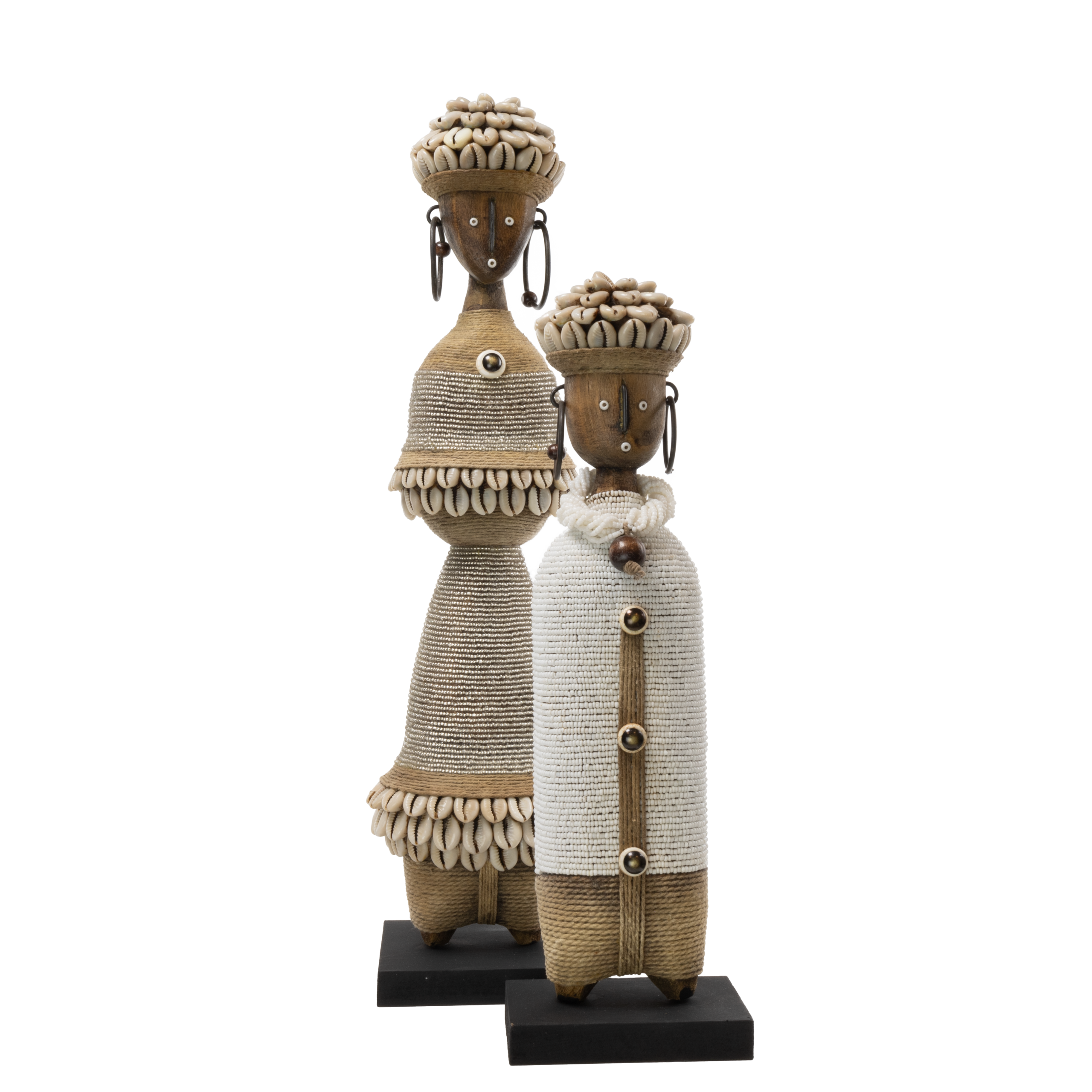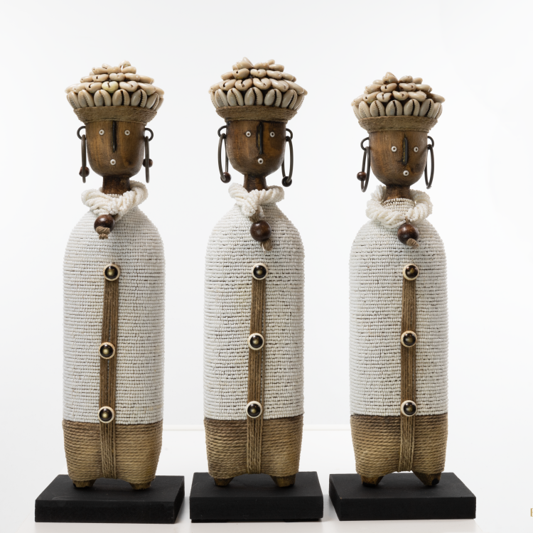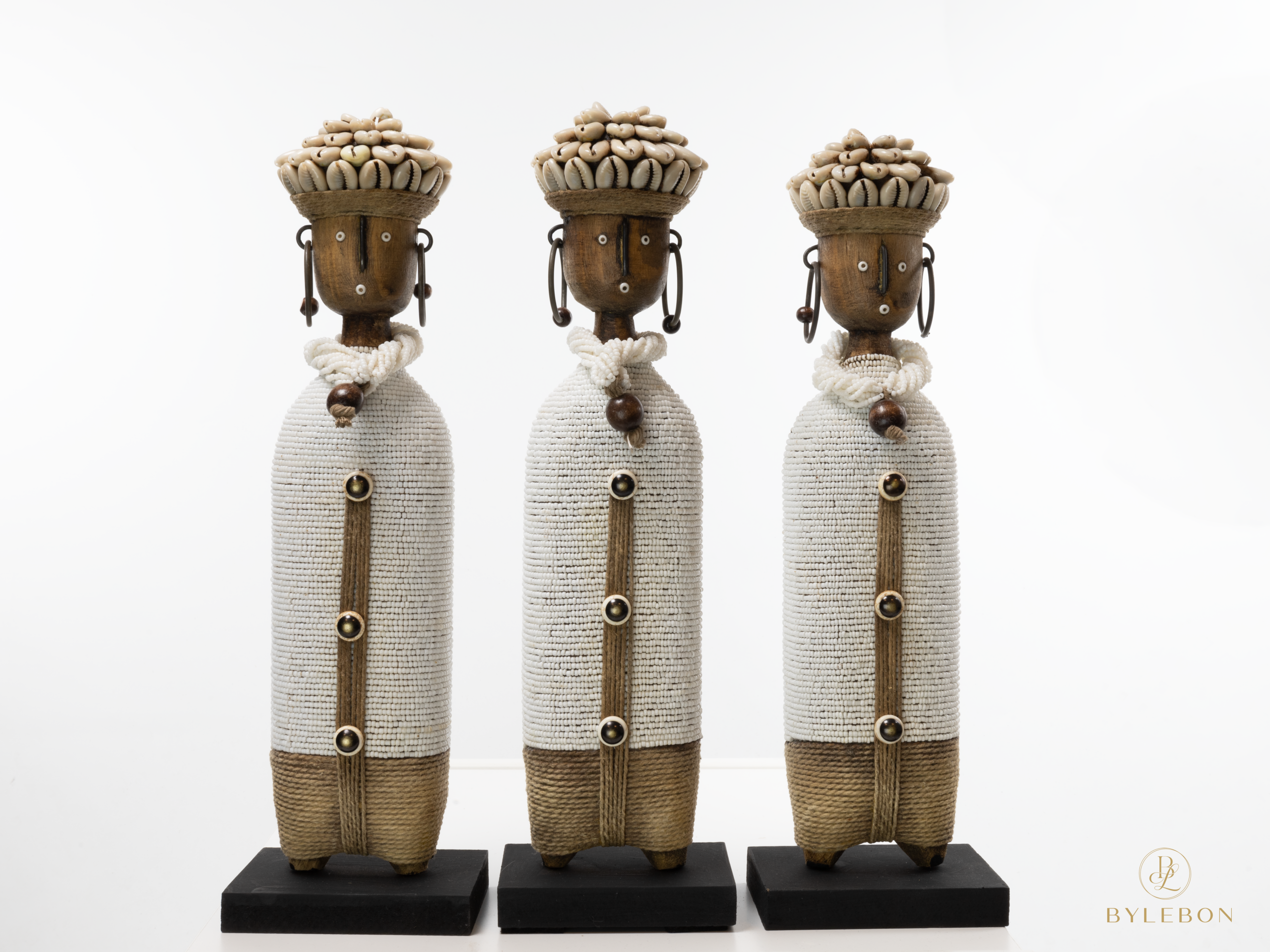 Poupée Namji – E12 faite à la main d’environ 34 cm avec des perles blanches épurées, des cauris et de subtils détails métalliques. Une pièce de décoration africaine élégante et authentique sur un socle noir robuste.