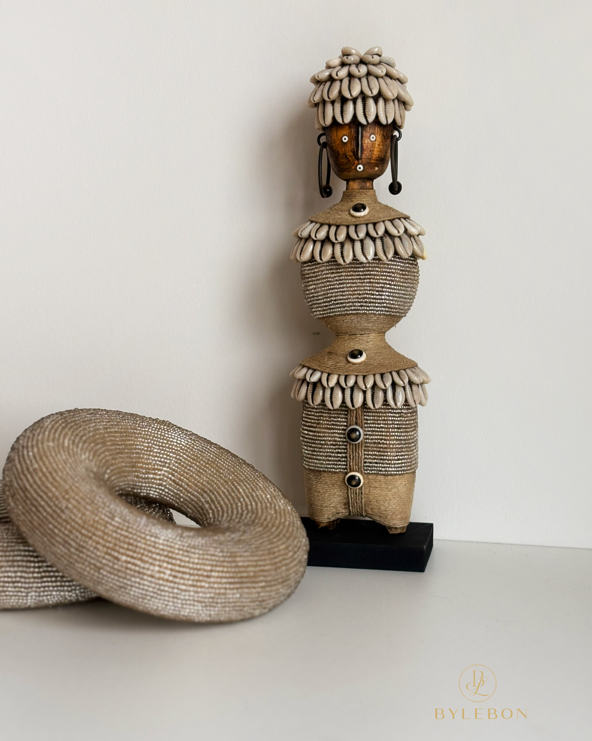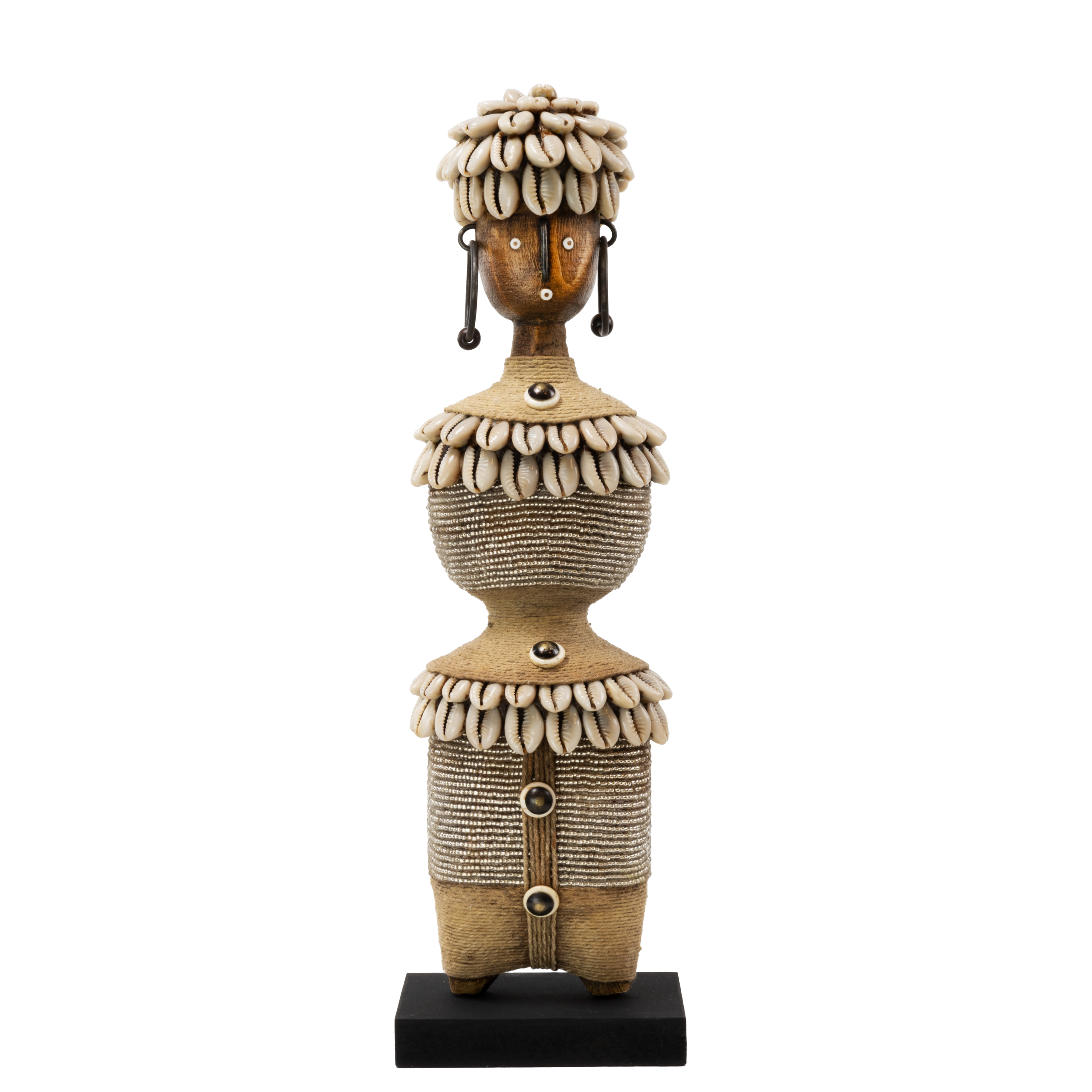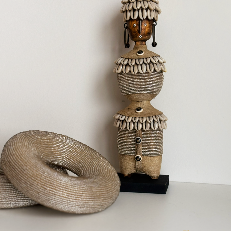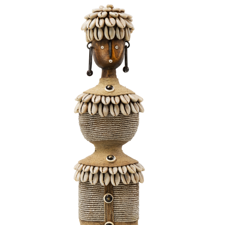 Une magnifique poupée Namji artisanale – E6 d’environ 34 cm de hauteur. Richement détaillée avec de fines perles, de la corde et des coquillages cauris. Le design a une allure luxueuse et repose solidement sur un socle noir.