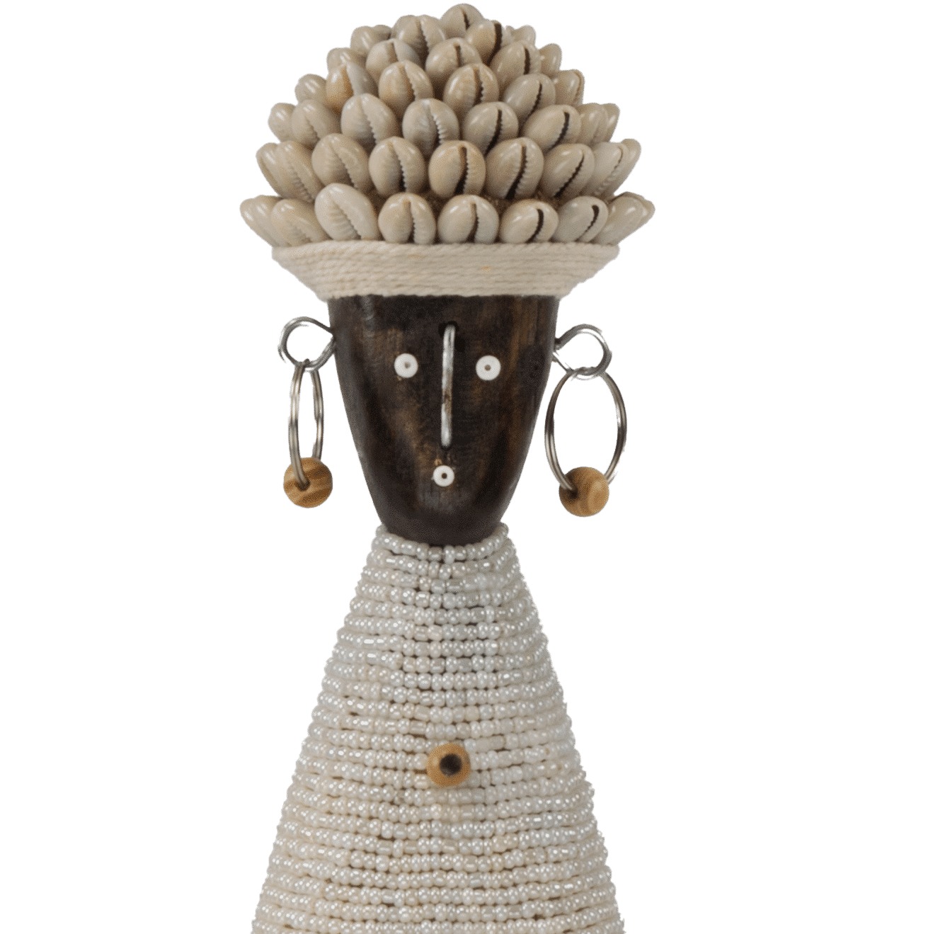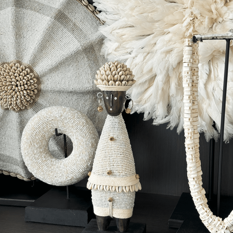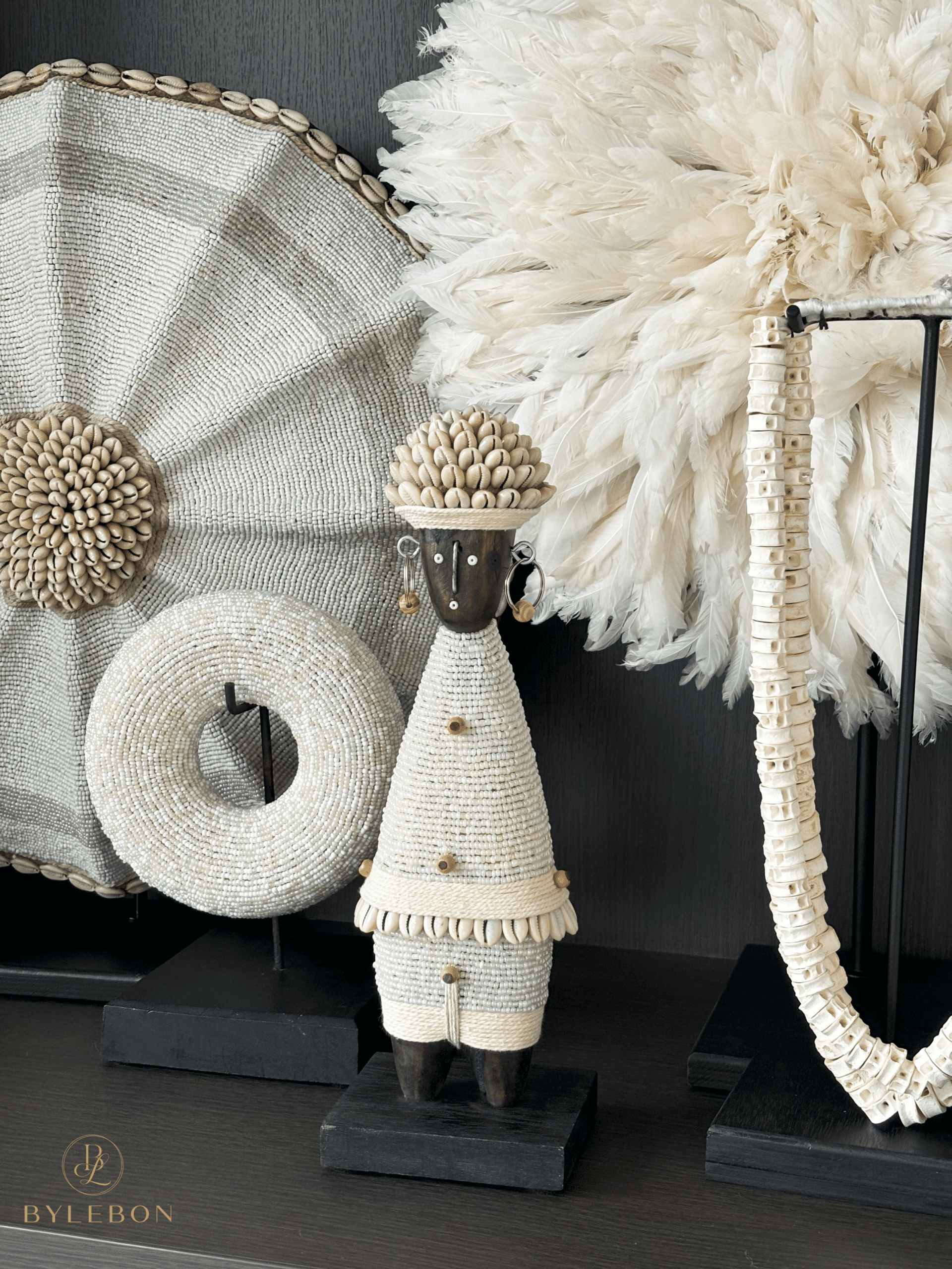 Cette poupée Namji – J1 est une œuvre d’art unique, richement ornée de perles nacrées et de détails raffinés. Son design subtil et neutre en fait un complément idéal à tout intérieur, qu’il soit moderne ou traditionnel. Livrée sur une élégante plateforme noire, prête à occuper une place spéciale dans votre maison.